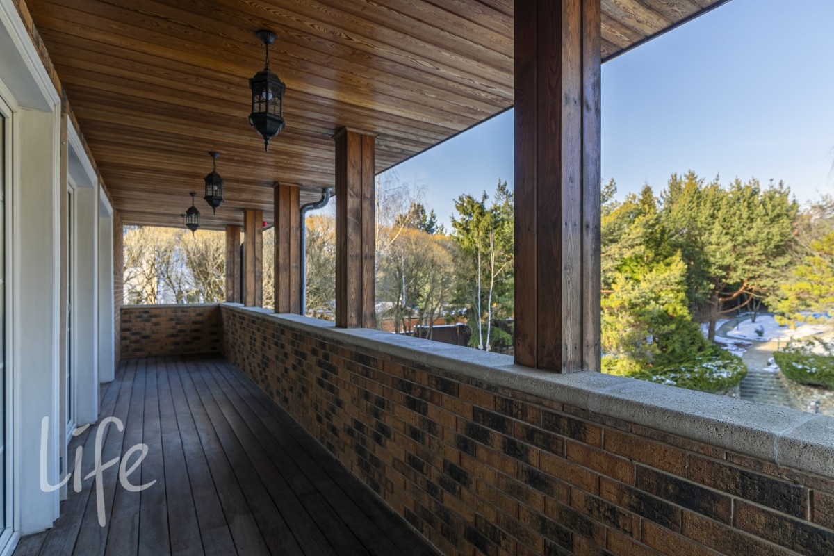 Общее для обеих спален патио 80м2 с потрясающим видом на участок и березовую рощу. Патио свободного назначения , правильной прямоугольной формы . Можно использовать как зону барбекью или для отдыха и загара . Можно застеклить и превратить в зимний сад или любая другая идея .