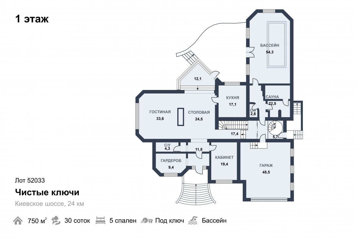1 этаж: прихожая, гардеробная, гараж на две машины, кабинет, гостиная-столовая с камином и сзимним садом, кухня, в отдельном крыле бассейн с сауной и выходом на патио.
