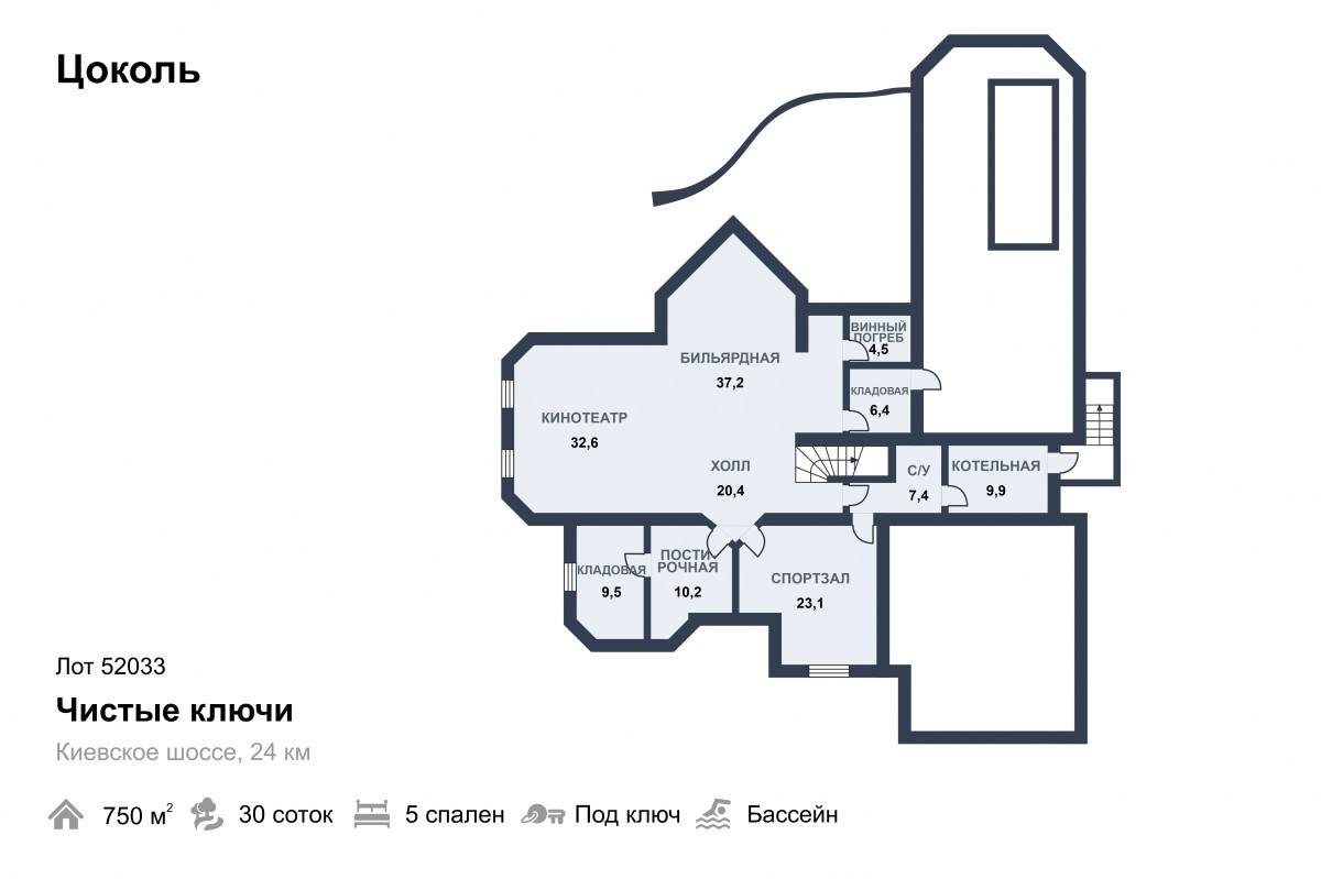Цоколь: Кинотеатр, бильярдная, спортзал, кладовая, постирочная, котельная, с/у, винная комната