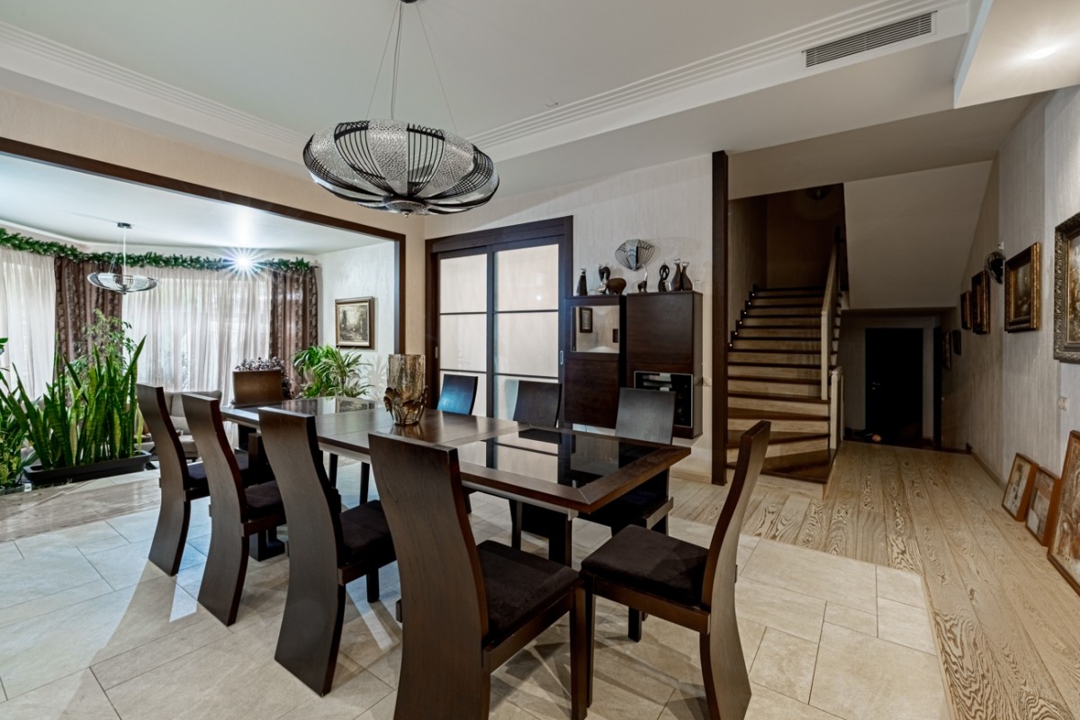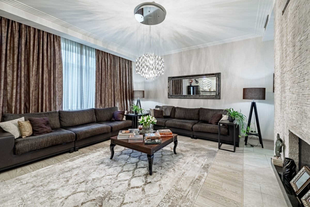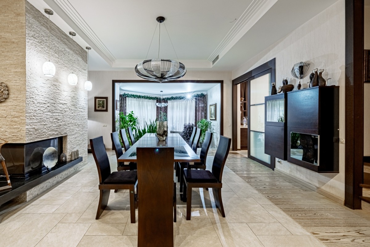 Просторная гостиная-столовая с камином на две стороны и с выходом в зимний сад.