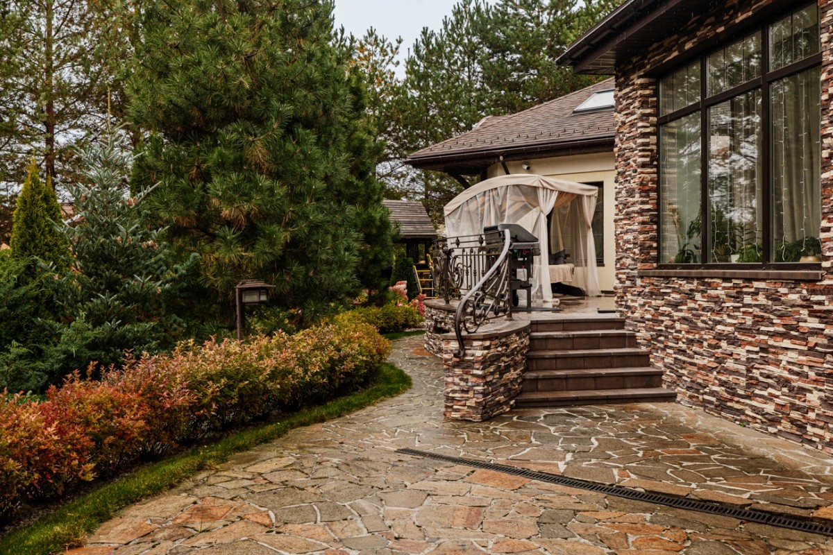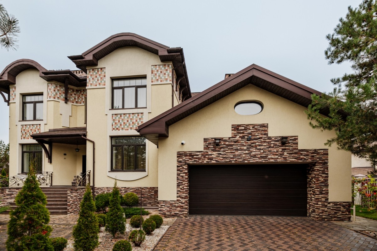 Обширная мощёная площадка перед домом, где можно разместить до 5 машин дополнительно к двухместному теплому гаражу.