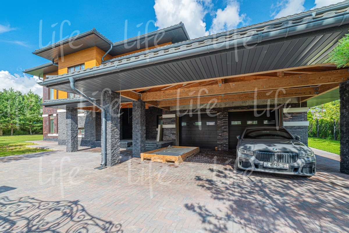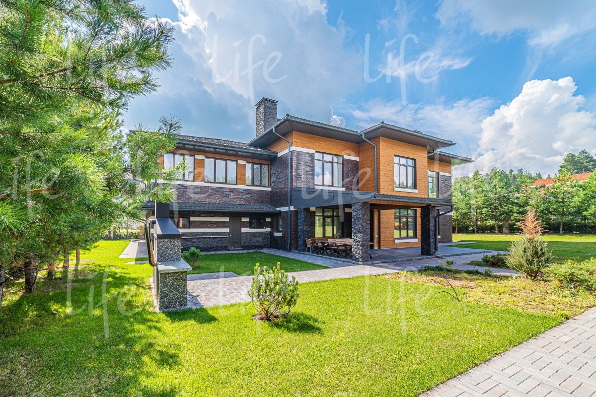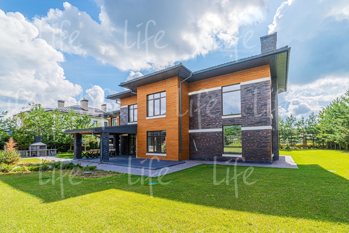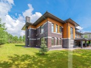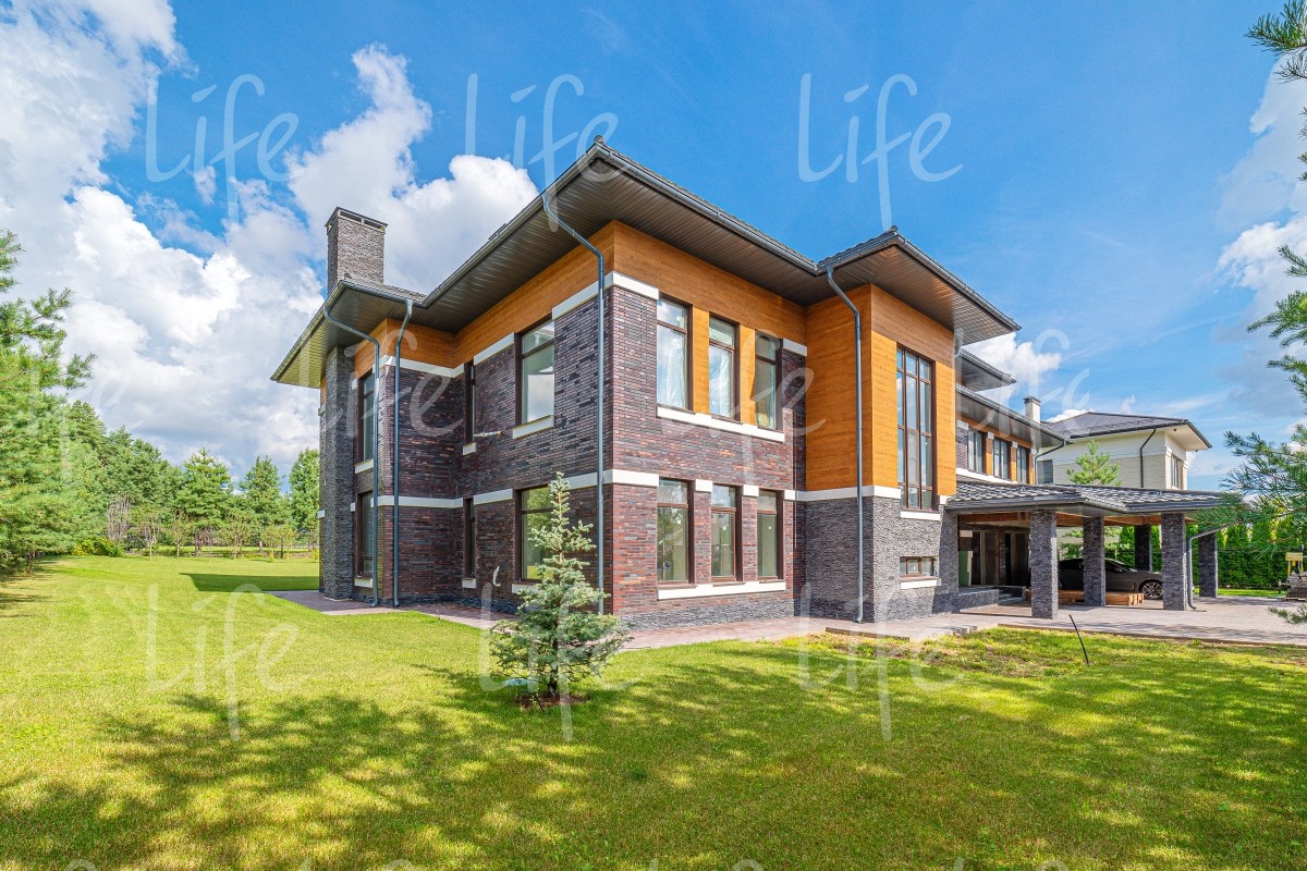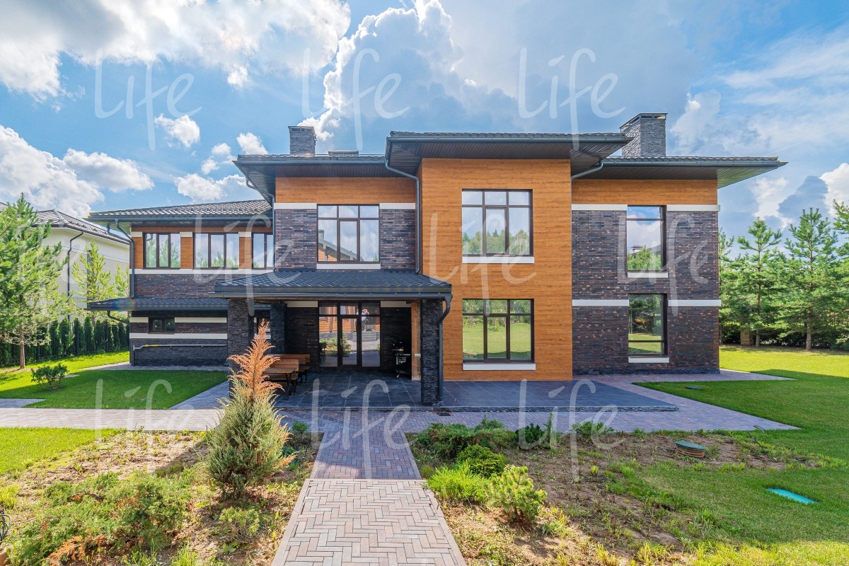 Коттеджный поселок премиум-класса «Ренессанс Парк». Новый дом в современном стиле Фрэнка Ллойда Райта выполнен. Внутренняя отделка в состоянии «White box». Фасад здания облицован каменным клинкером и деревянными досками. Входная группа включает широкое крыльцо и навес на два автомобиля. Крыша покрыта композитной черепицей. В настоящее время идут чистовые отделочные работы внутри дома. Проект дизайна интерьера прилагается к дому.