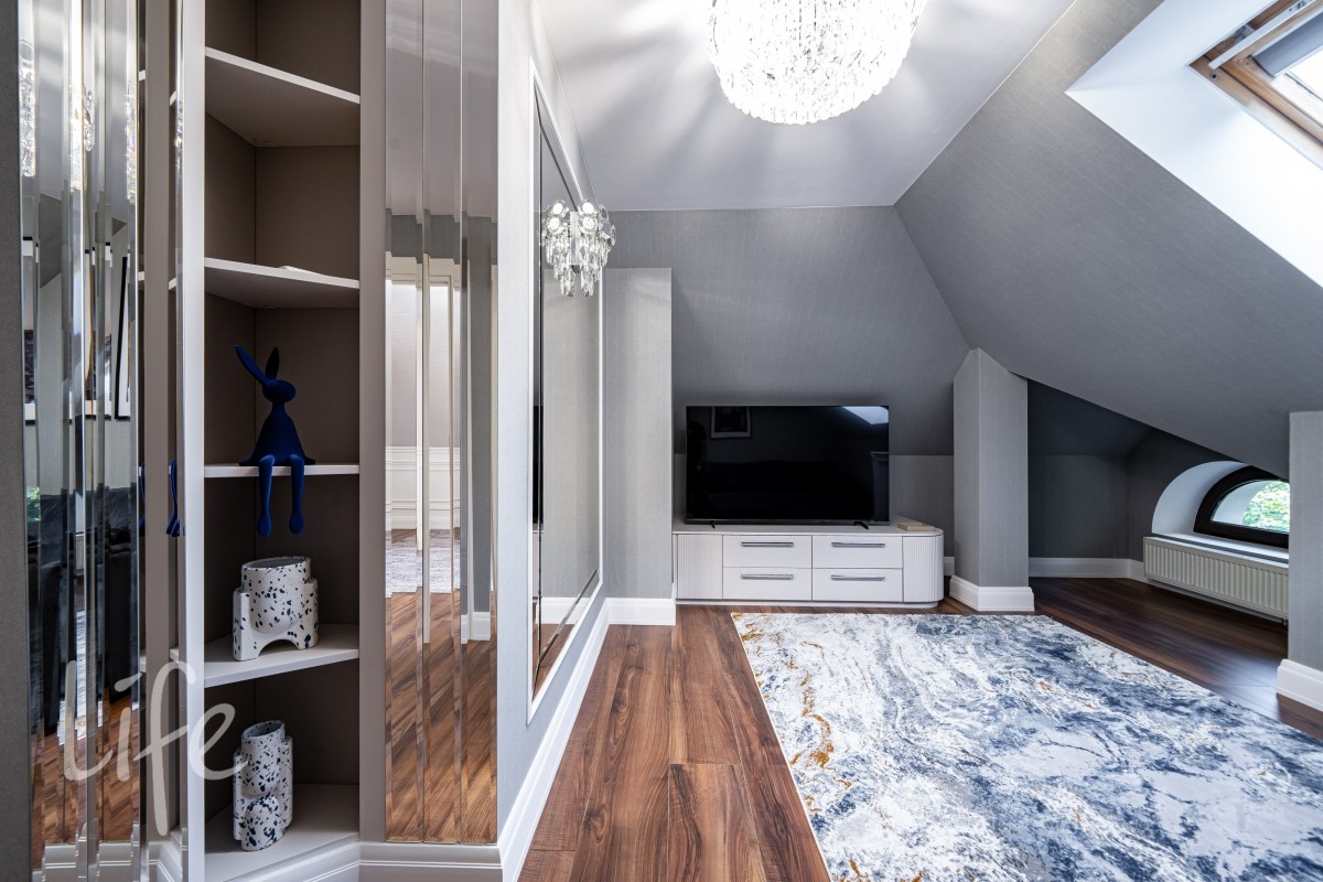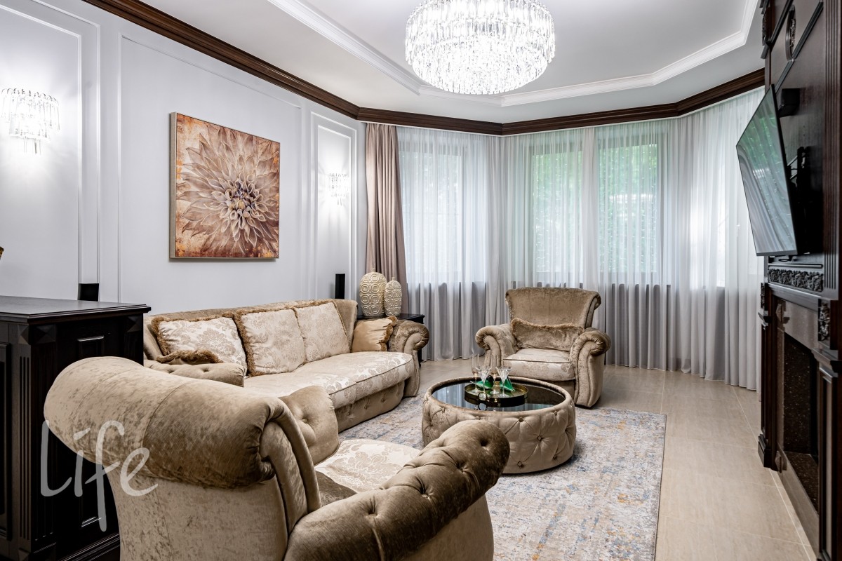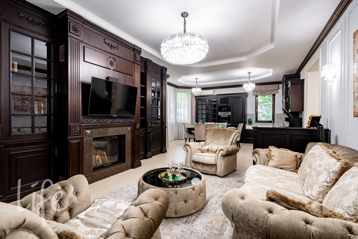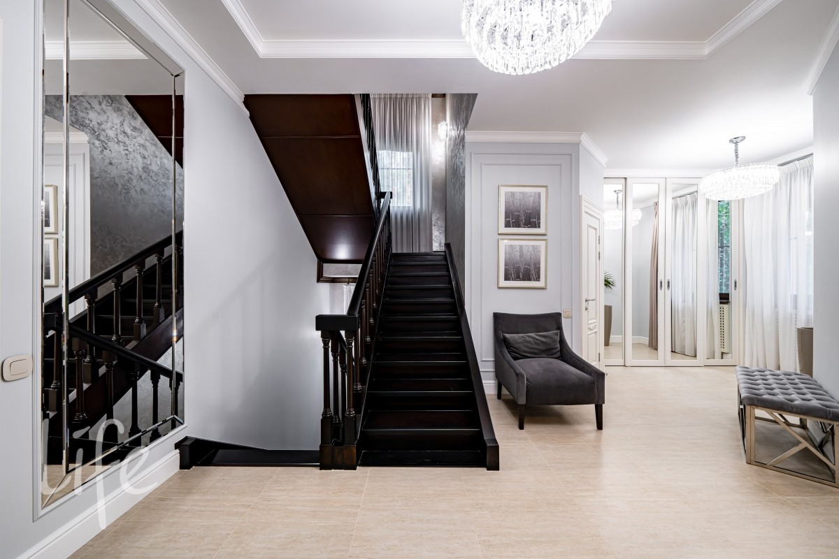 Внутреннее пространство декорировано в едином силе и продумано до мелочей, будущих владельцев ждет комфортная счастливая жизнь в загородной резиденции.