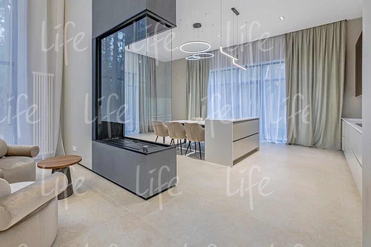 Дизайнерский интерьер выполнен в современном стиле, в мягких, светлых тонах. Со вкусом подобрана мебель и аксессуары. Использованы современные световые решения. Гостиная с вторым светом, высота потолков около девяти метров, ее украшает двухсторонний камин.