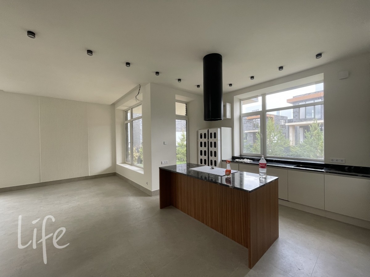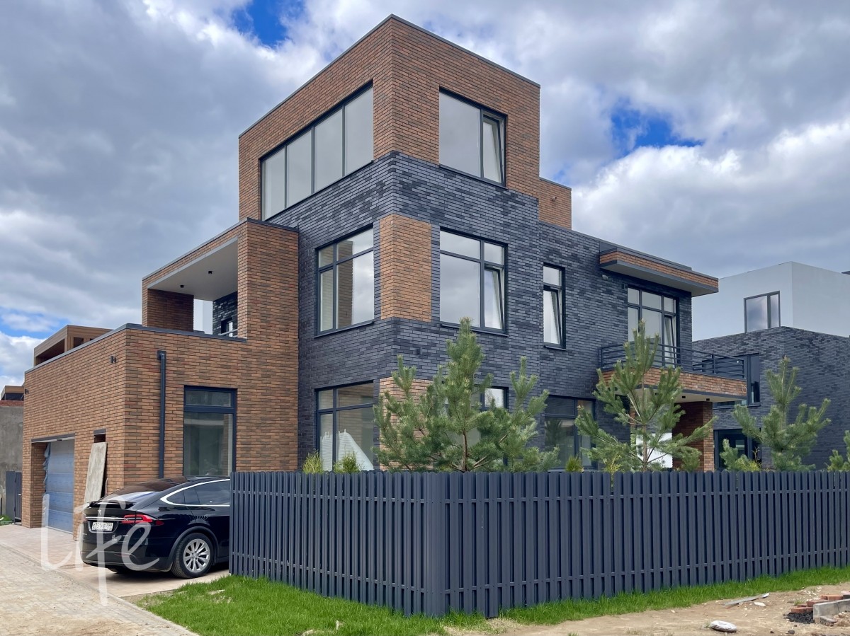 Охраняемый коттеджный поселок. Дом жилой, полностью под ключ, меблирован и оборудован всей необходимой бытовой техникой. Модный экстерьер дома, панорамное остекление, плоская кровля.