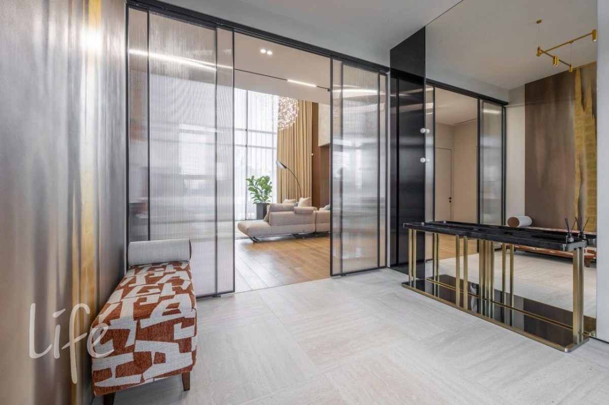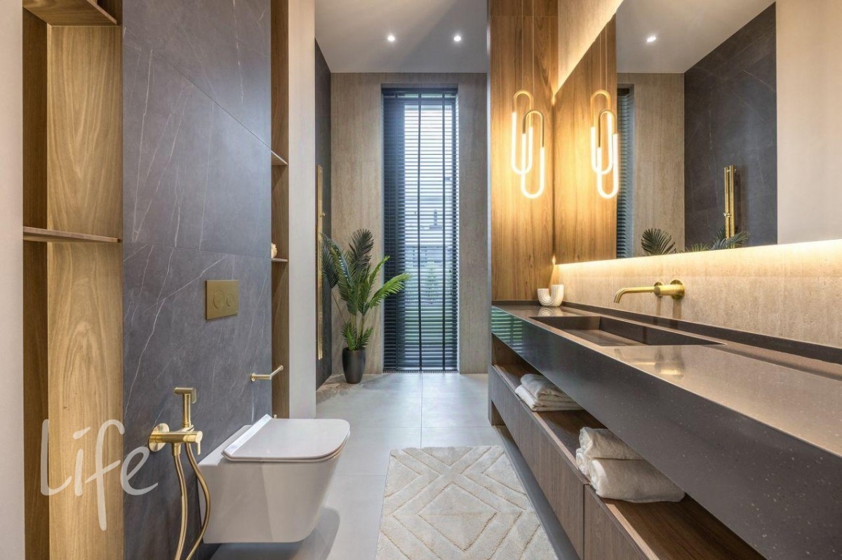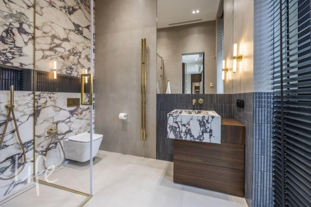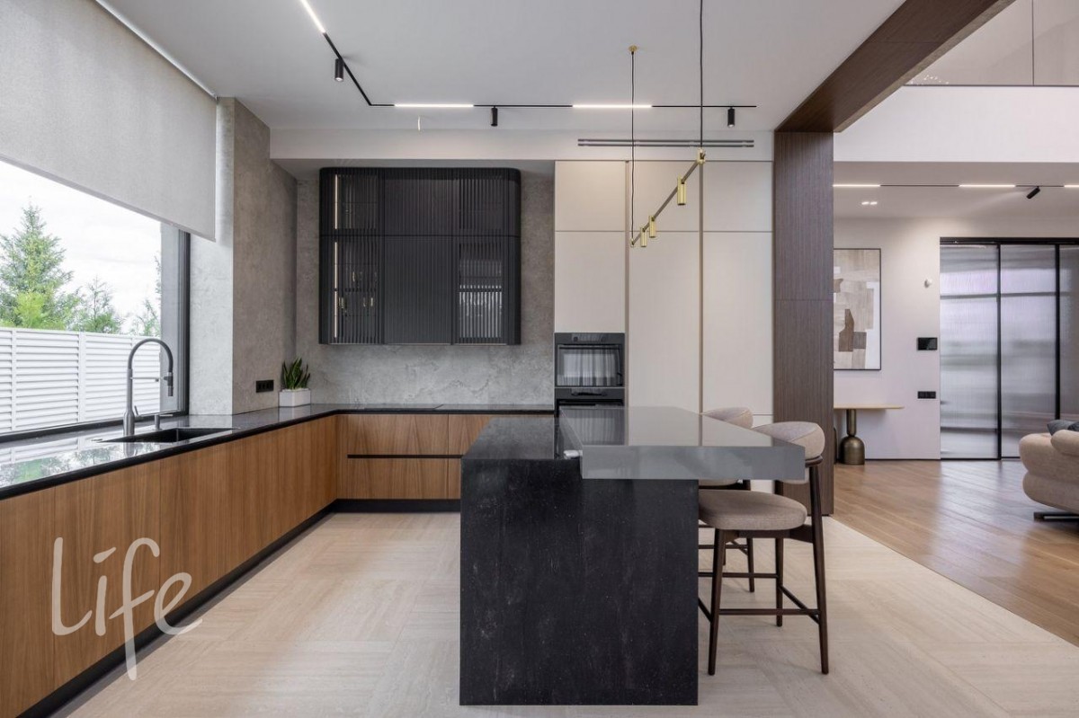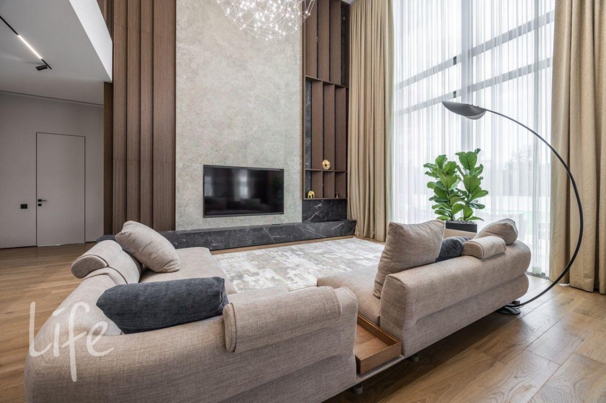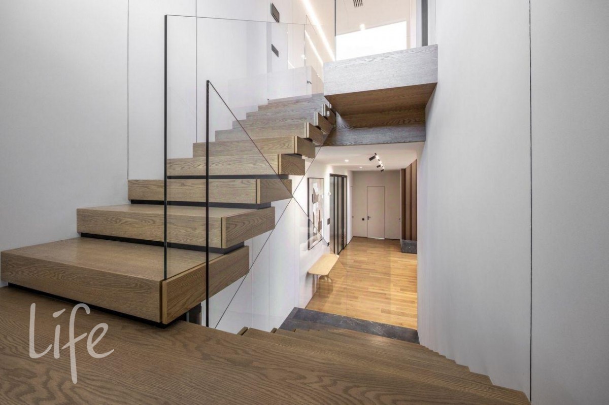 Конструктив: монолитные фундамент, каркас и перекрытия, стены — теплая керамика, двери и окна от компании SCHUCO. Фасад дома — итальянская плитка Laminam, тонкостенный керамогранит. Белая часть здания отделана американской самозатягивающейся штукатуркой, которая способна скрывать небольшие царапины. Рейки на фасаде выполнены из древесно-полимерного композита (ДПК), производства Австрии.