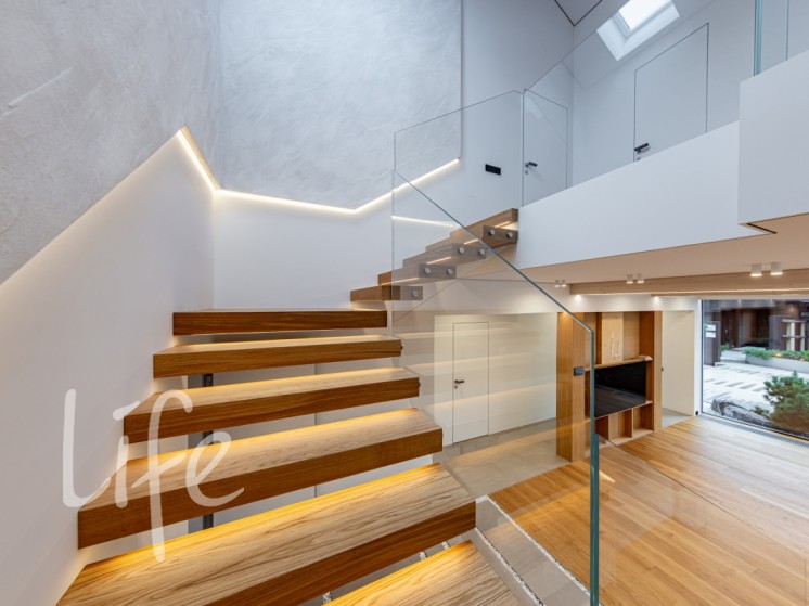 При строительстве и отделке использовались только самые качественные материалы, включая продукцию брендов Kink Light, Sаlini, Тесе, Веlbаgnо и многих других. В конструкции дома применяется клееная конструкционная балка премиум-класса, а панорамные окна в пол Guаrdiаn обеспечивают высокий уровень энергоэффективности. На террасу ведёт сдвижной портал в деревянной раме, что придаёт дому уютный и современный вид.