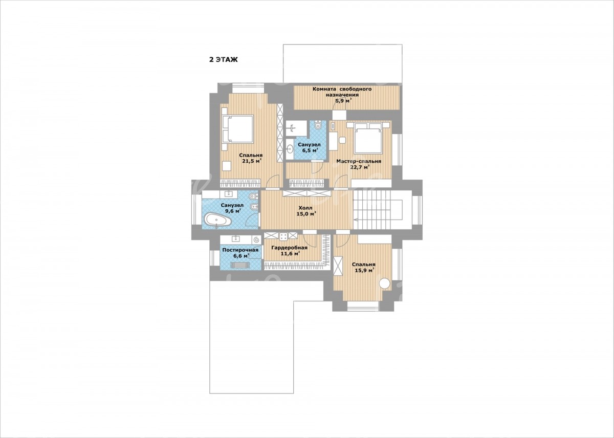 2 этаж: мастер-спальня (22,7) с ванной (6,5) и гардеробной (5,9), детские (21,5 и 15,9) с общей ванной (9,6), гардеробная (11,6), постирочная(6,6).
