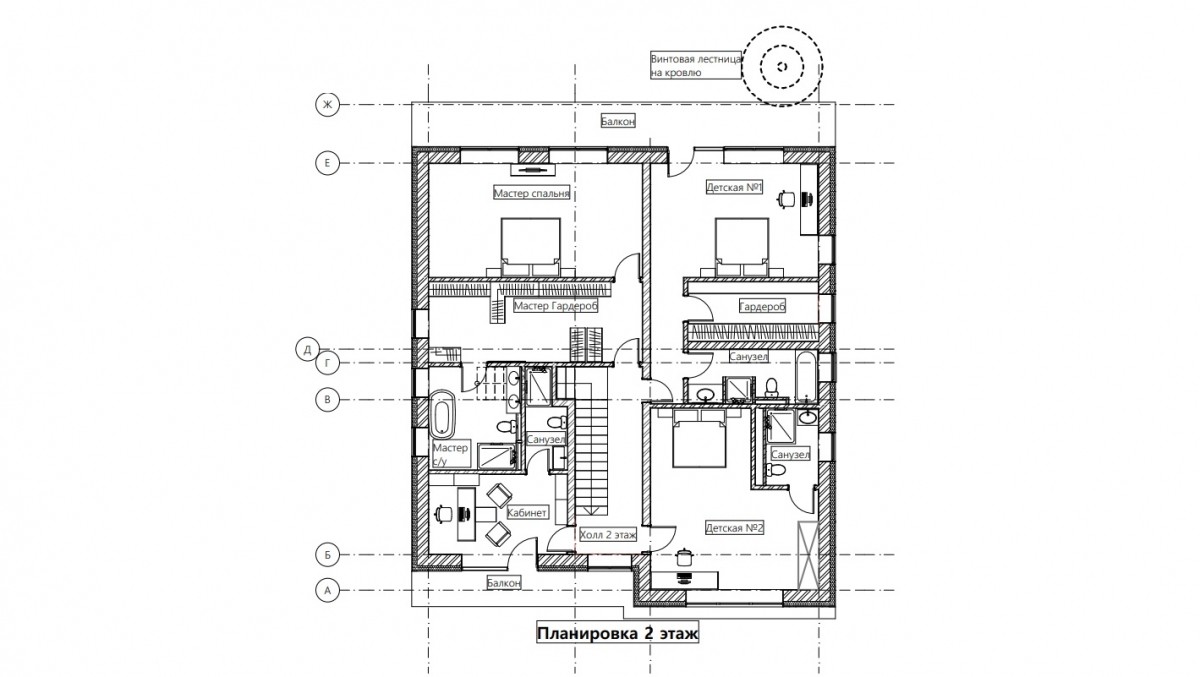 2 этаж: холл, мастер-спальня с с/у и гардеробной, спальня с гардеробной и с/у, две спальни с/у, балконы.