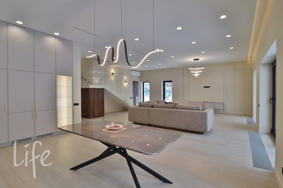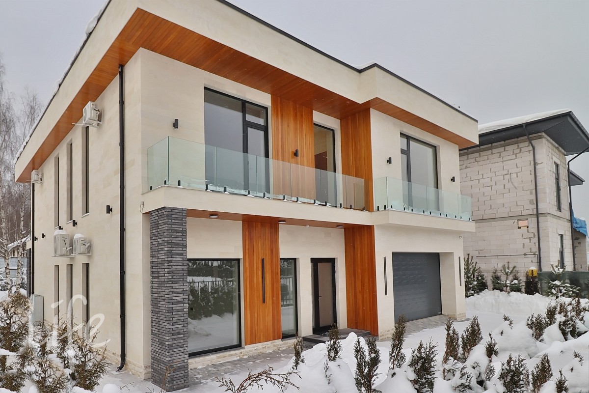 Новый дом в стиле хай-тек, полностью под ключ, установлен красивый кухонный гарнитур, частично меблирована гостиная.