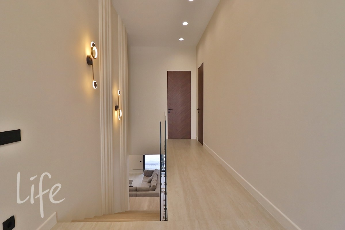 Современный интерьер в мягких нюдовых тонах с декоративными элементами из гипса, несколько минималистический, не оставит никого равнодушными. Цветовые оттенки стен, тщательно подобранные, сочетающиеся с натуральным напольным покрытием и дверями из американского ореха, создают ощущение гармонии и комфорта. Большие панорамные окна наполняют пространство естественным светом, визуально расширяют его и создают ощущение единства с природой.