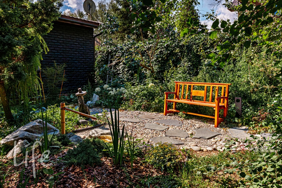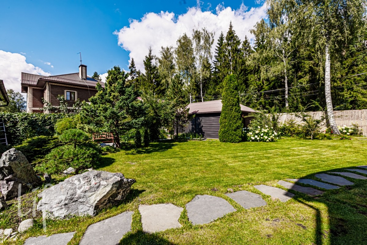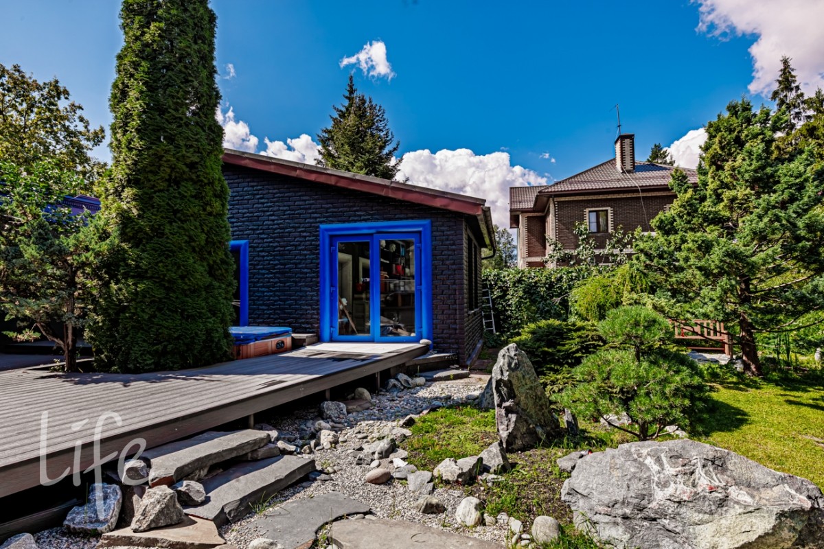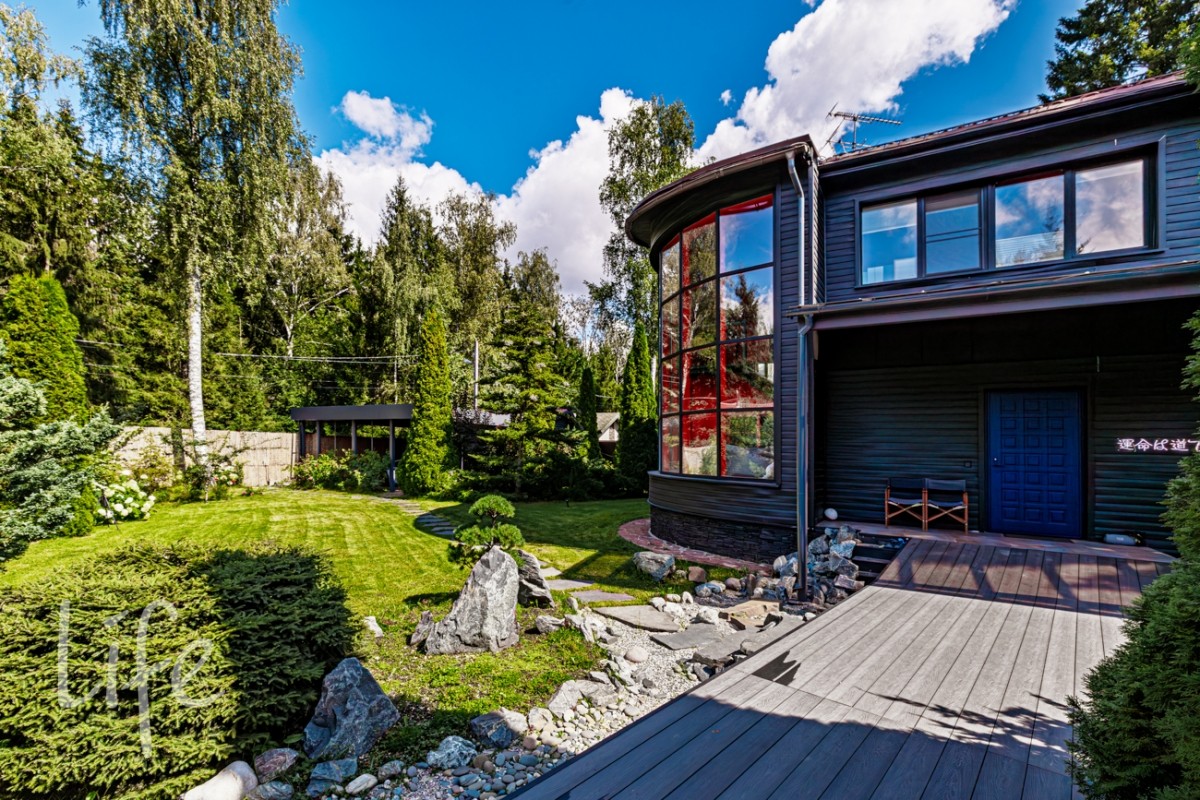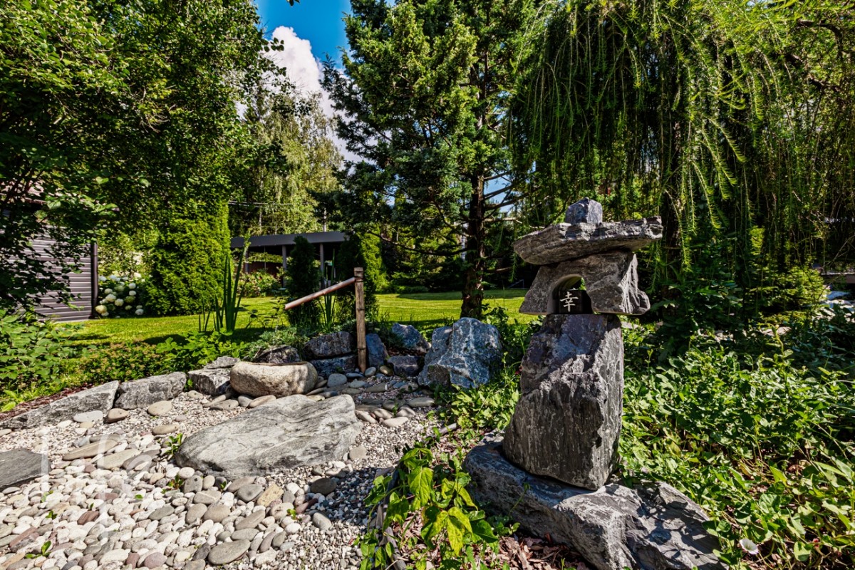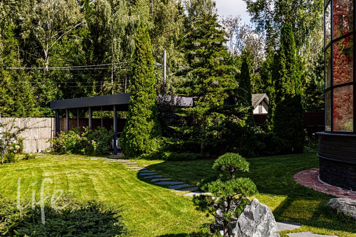 Красивый участок, граничащий с лесом, авторский ландшафт сада в японском стиле.