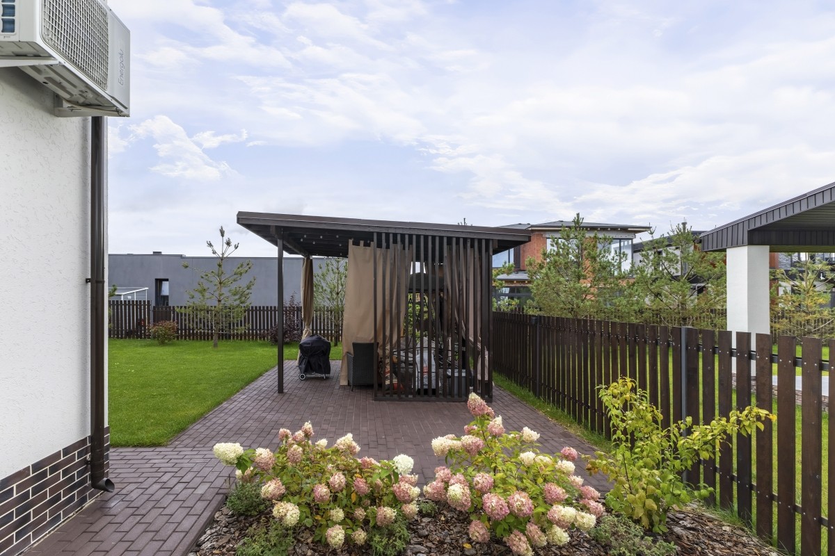 Участок правильной прямоугольной формы, газон, парковка для автомобиля. На территории расположена беседка, барбекю.