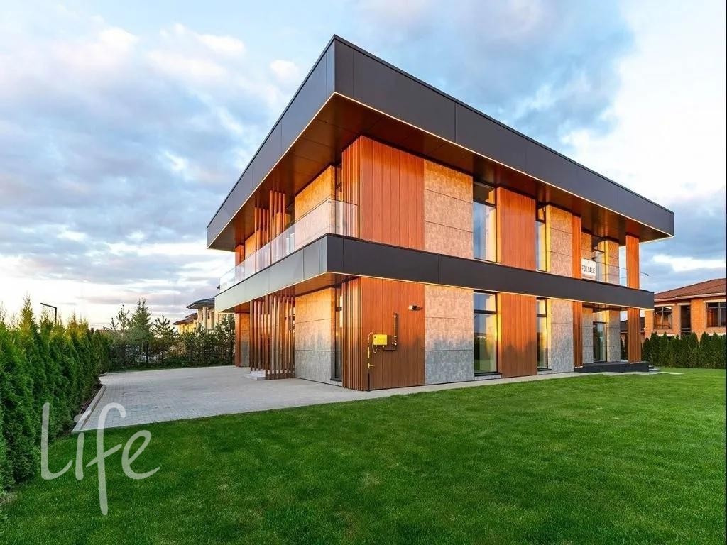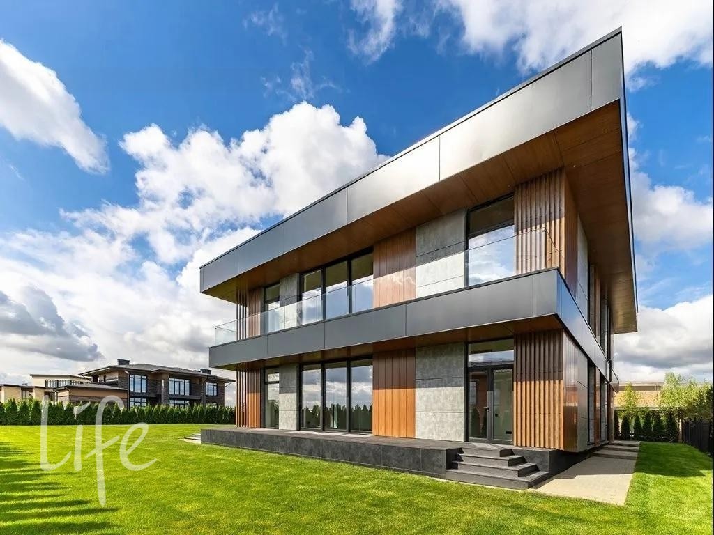 Элитный коттеджный поселок «Миллениум Парк». Новый уникальный зaгopoдный дом в современном стиле, с панорамным остеклением и плоской эксплуатируемой кровлей. Общая площадь дома 878 м2, из них 300 м2 террасы.