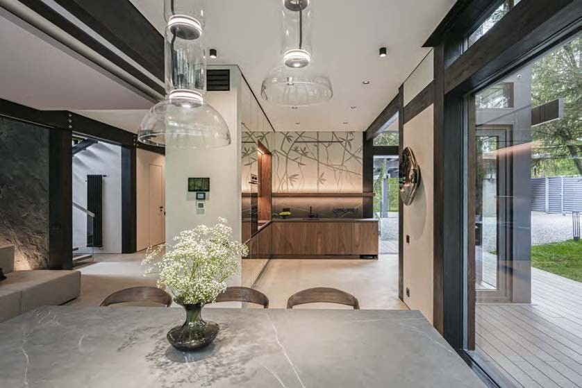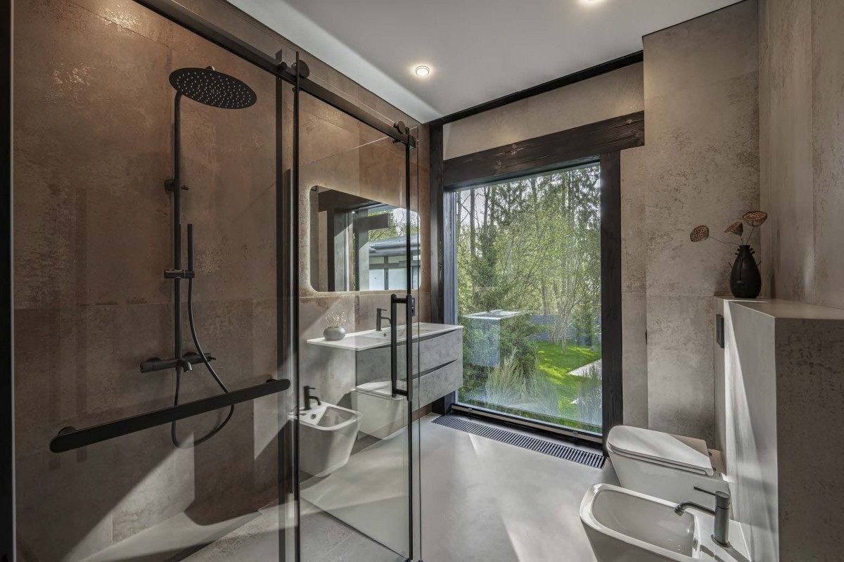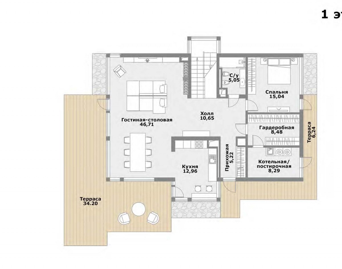 1 этаж: гостиная-столовая, кухня, холл, спальня, гардеробная, су, котельная, прихожая, терраса.