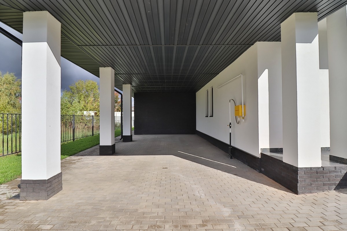 1 этаж: прихожая, гостиная-кухня-столовая с вторым светом с выходом на летнюю веранду, с/у, спальня, бойлерная/постирочная, кладовая с входом с улицы, навес для автомобиля, интегрированный с домом.