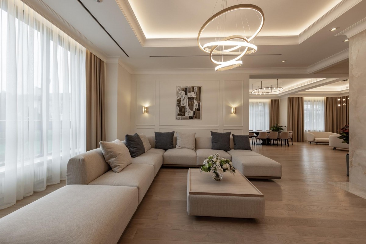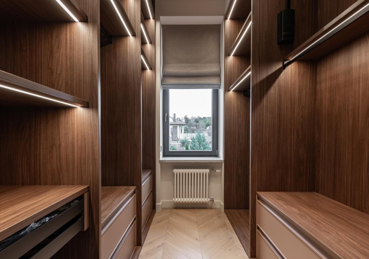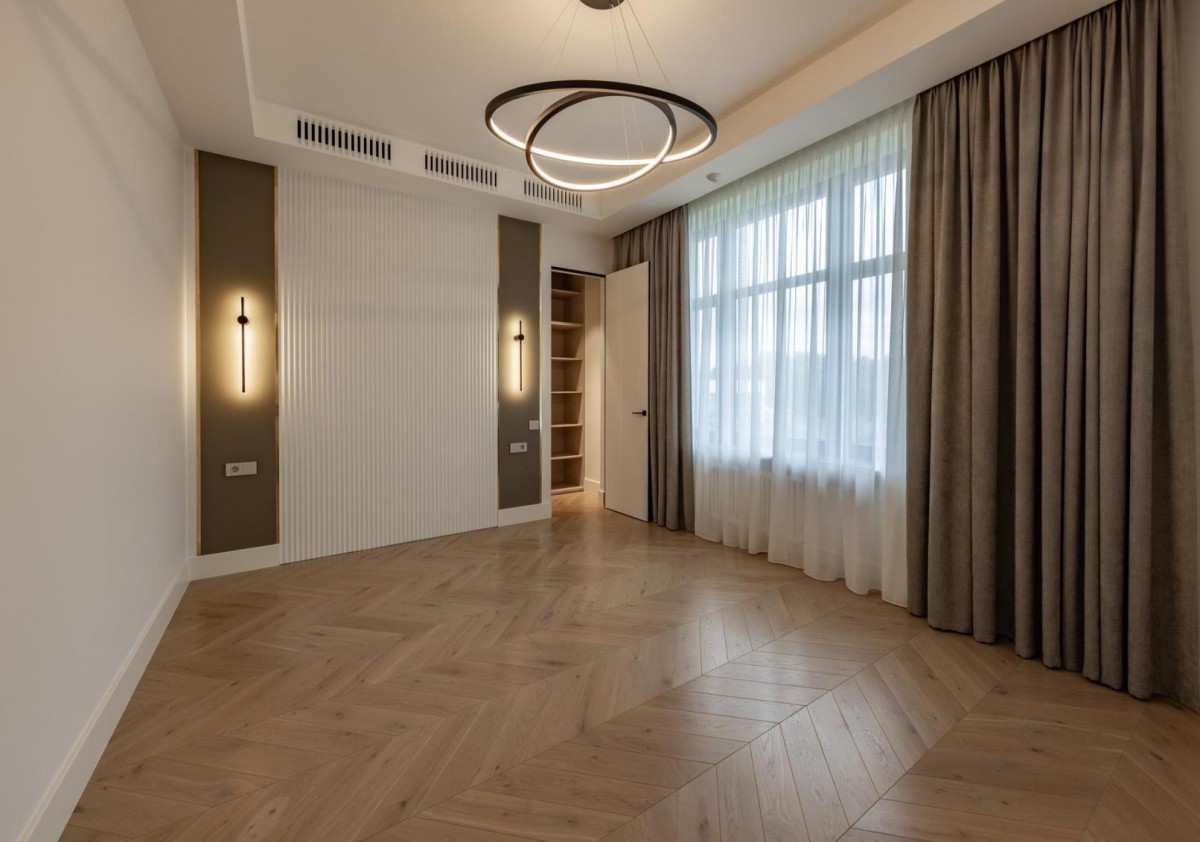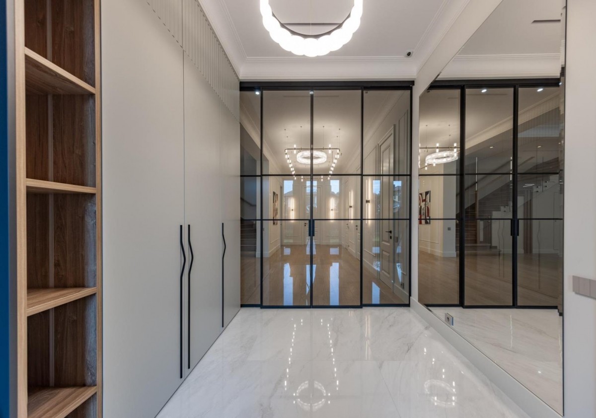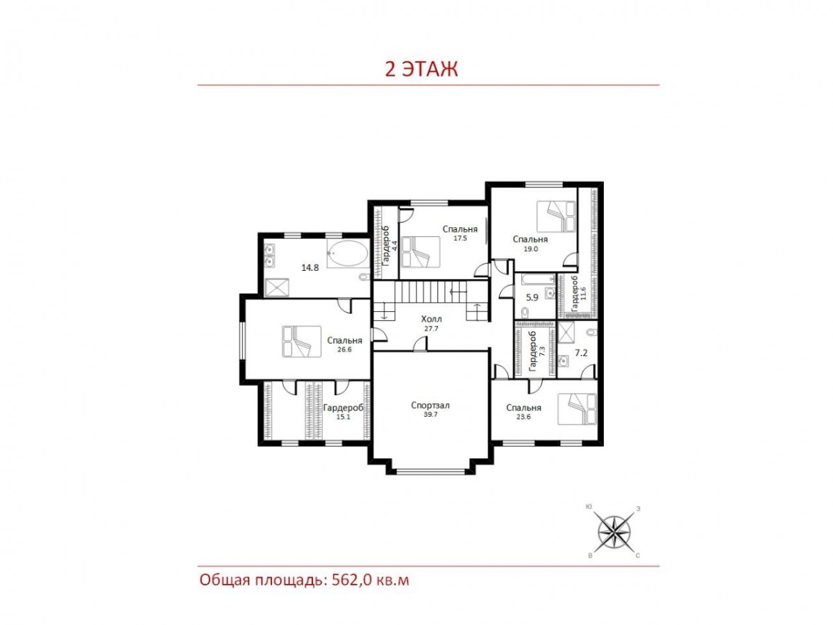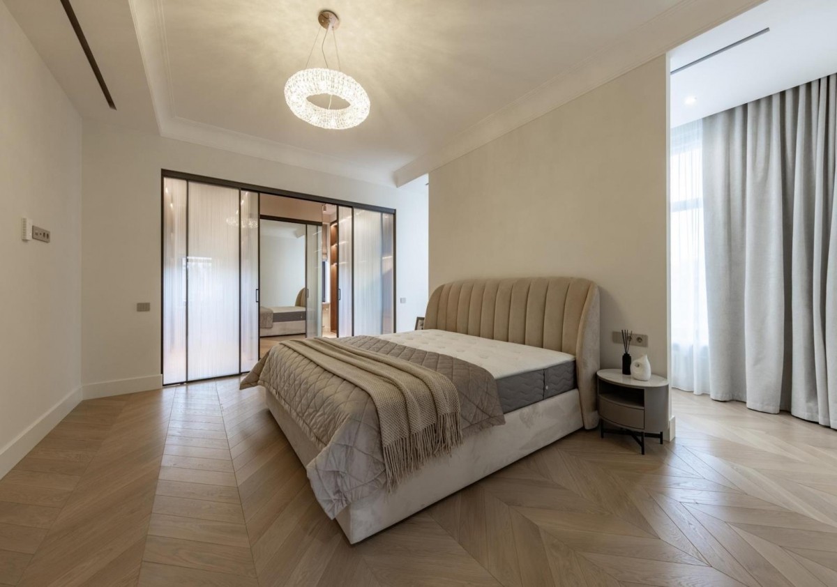 2 этаж: хозяйский блок с большой гардеробной и су, спальный блок с двумя спальнями, с 2 гардеробными и су, спальня с су, спортзал/игровая, зона библиотеки, паркет на полу, высота потолка 3,1м.