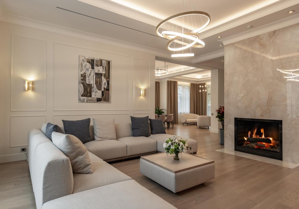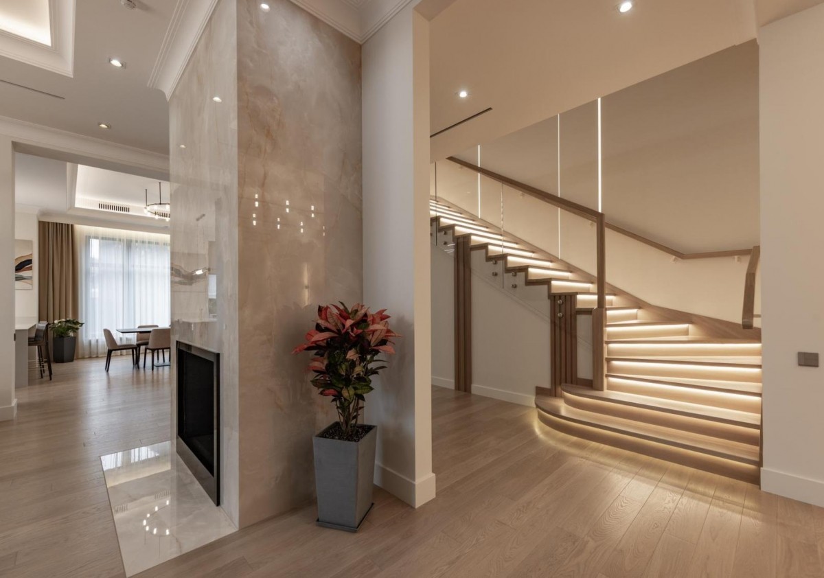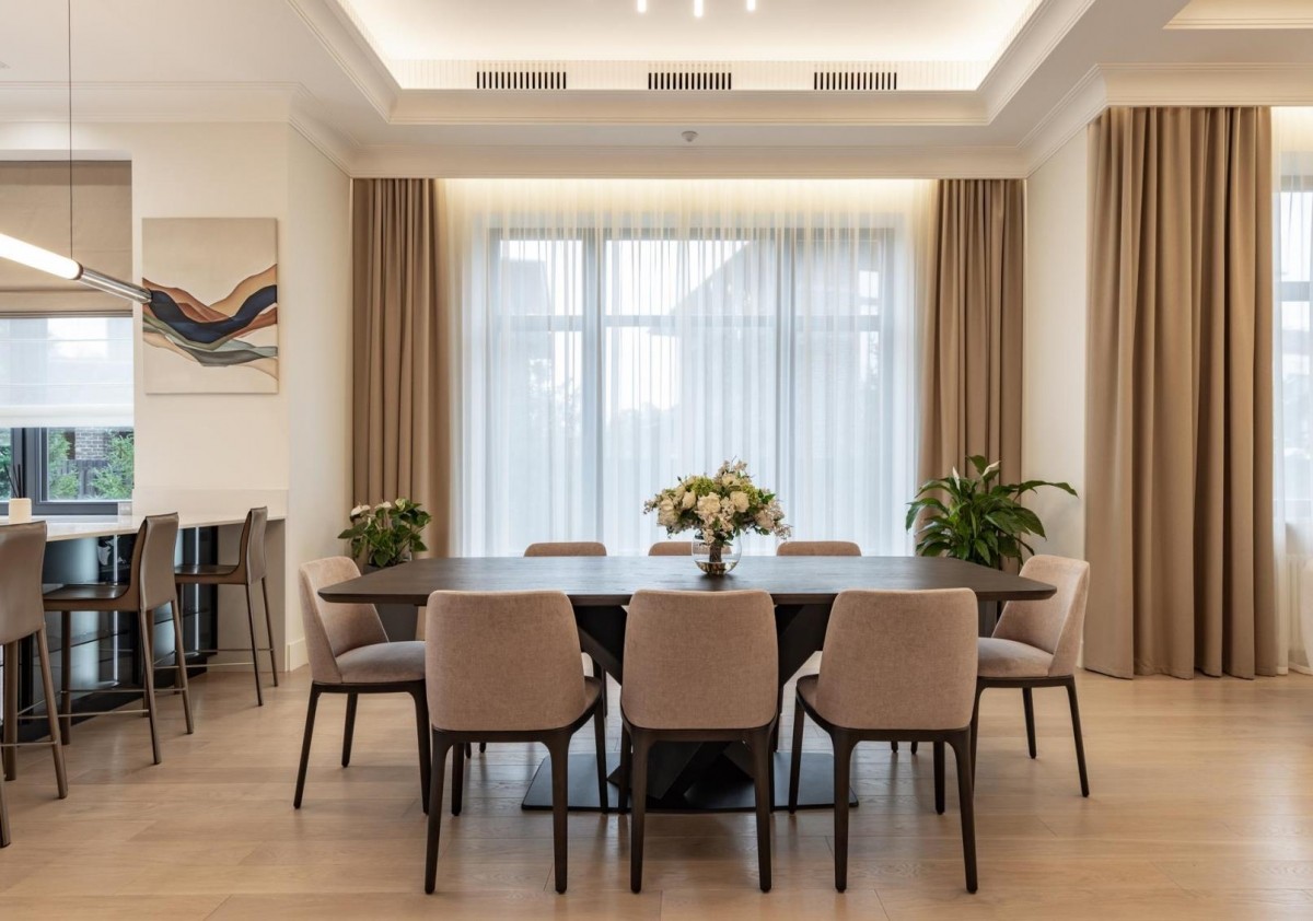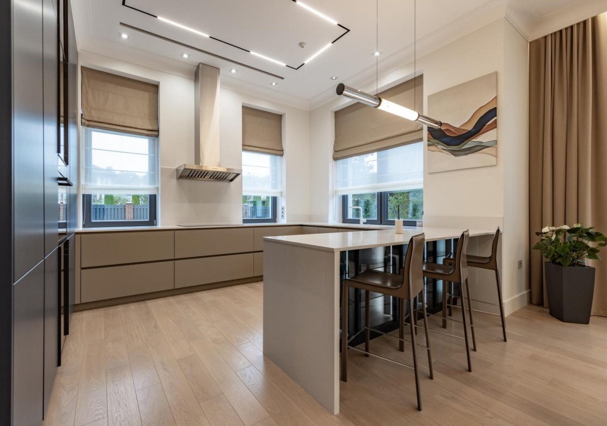 1 этаж: прихожая, гардеробная, постирочная, кладовая, игровая комната, спальня первого этажа, гостевой с/у, немецкая кухня с встроенной техникой Kuppersbusch, с вытяжкой Marte Pro c вентиляцией на крыше, два холодильника Liebherr, столовая зона с выходом на крытую террасу, гостиная с камином, высота потолка 3,8м, пол - массив дуба, теплый пол в зоне плитки.