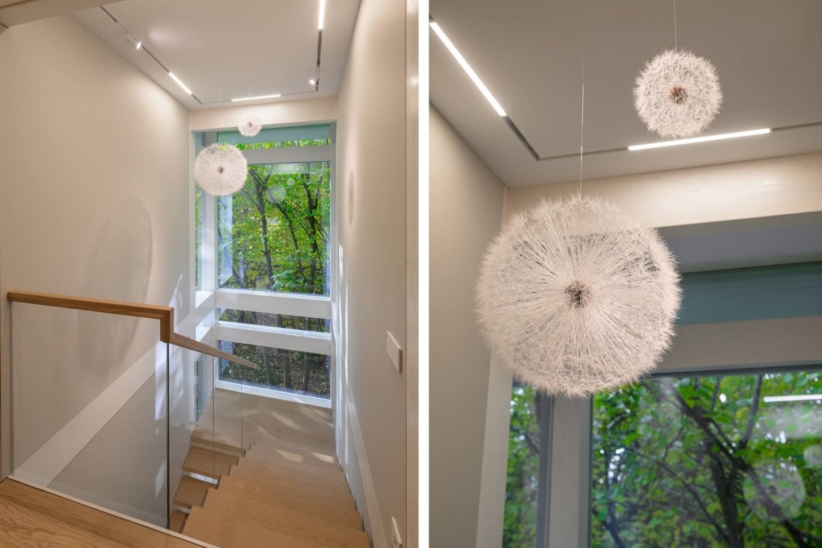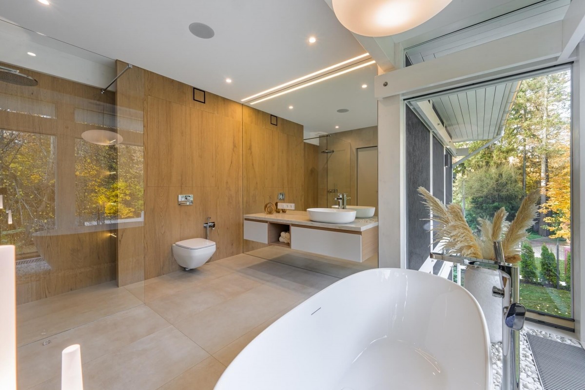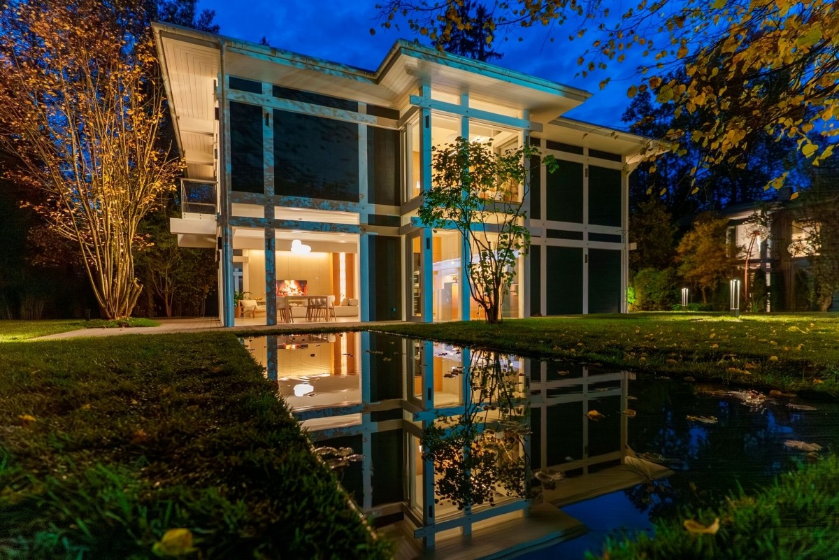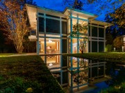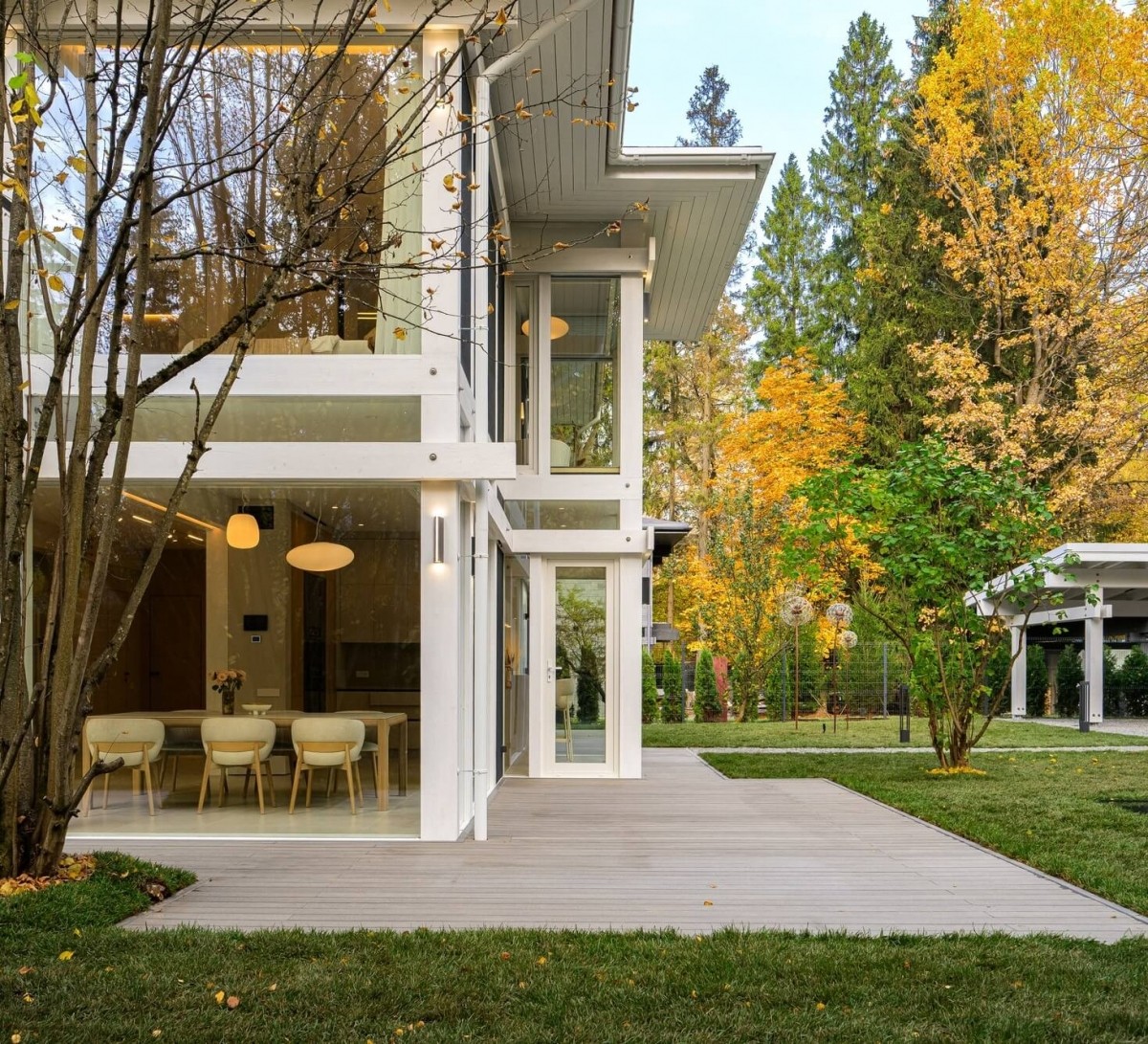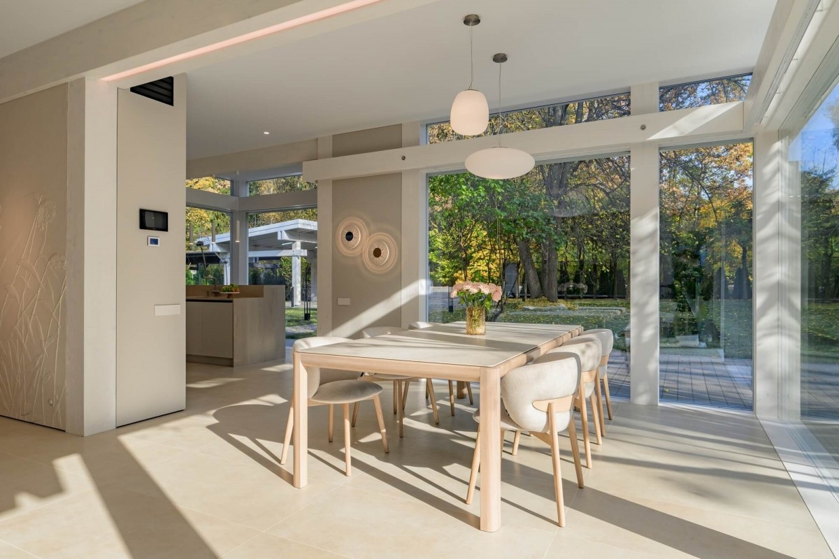 Стеклянные стены от пола до потолка, потрясающие виды на собственный сад, высокие потолки, высококачественная отделка, эксклюзивное цветовое решение стен, монолитное межэтажное перекрытие и как следствие -отсутствие «торчащих» батарей, межкомнатные стены из пазогребневых блоков.