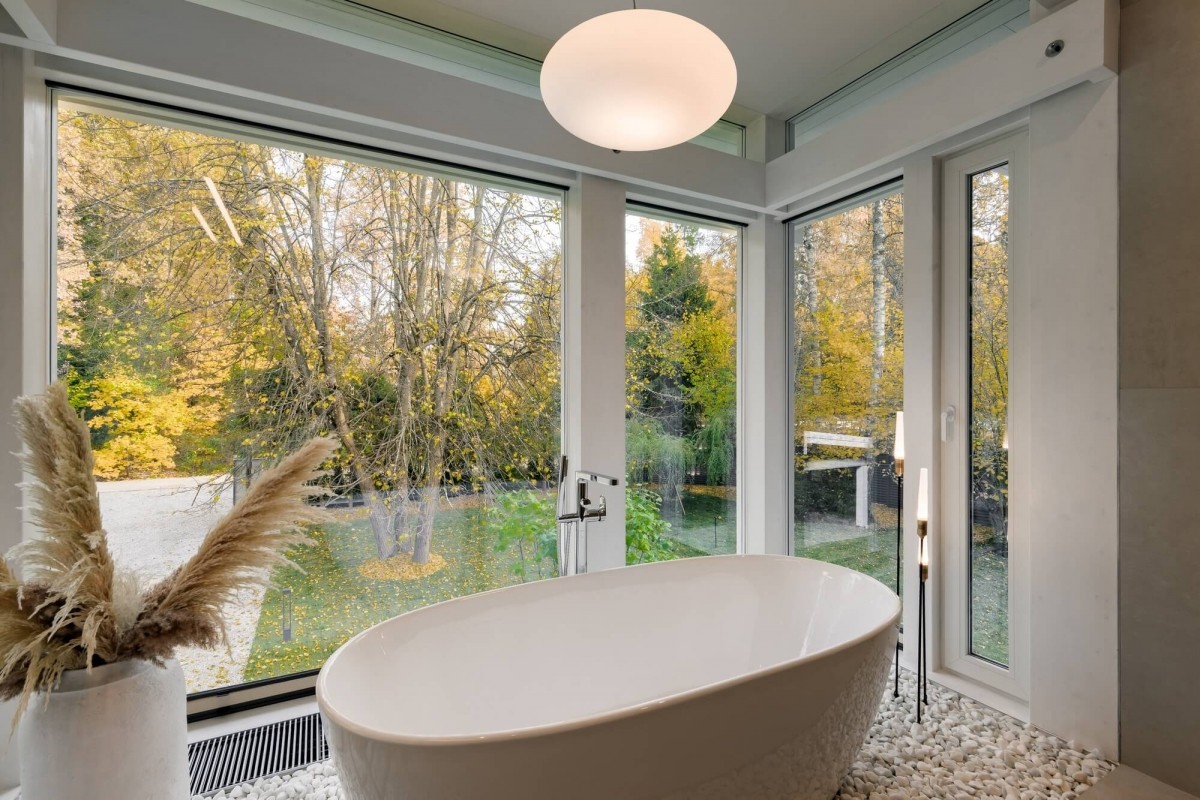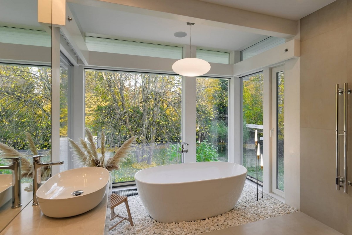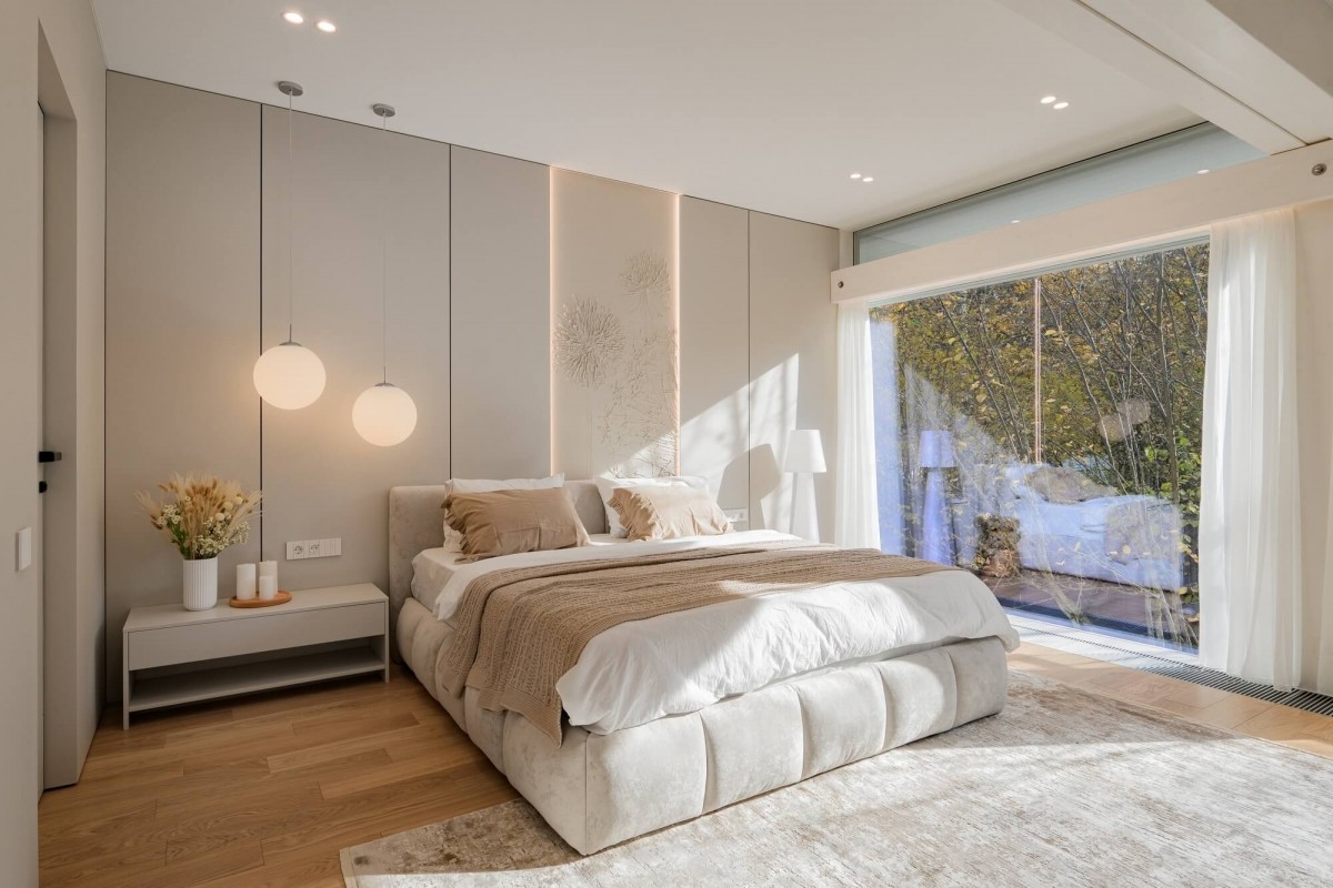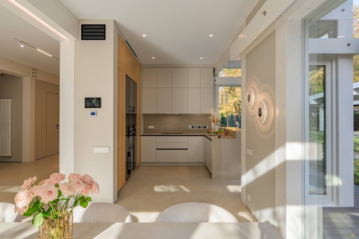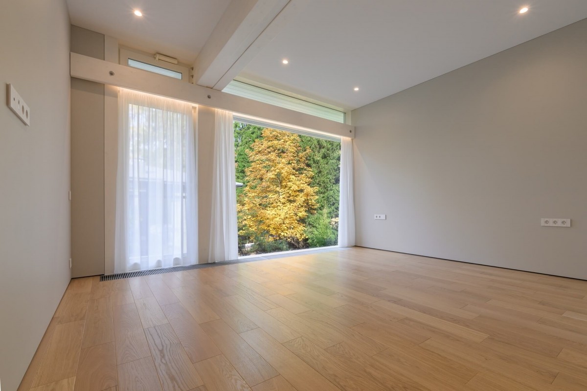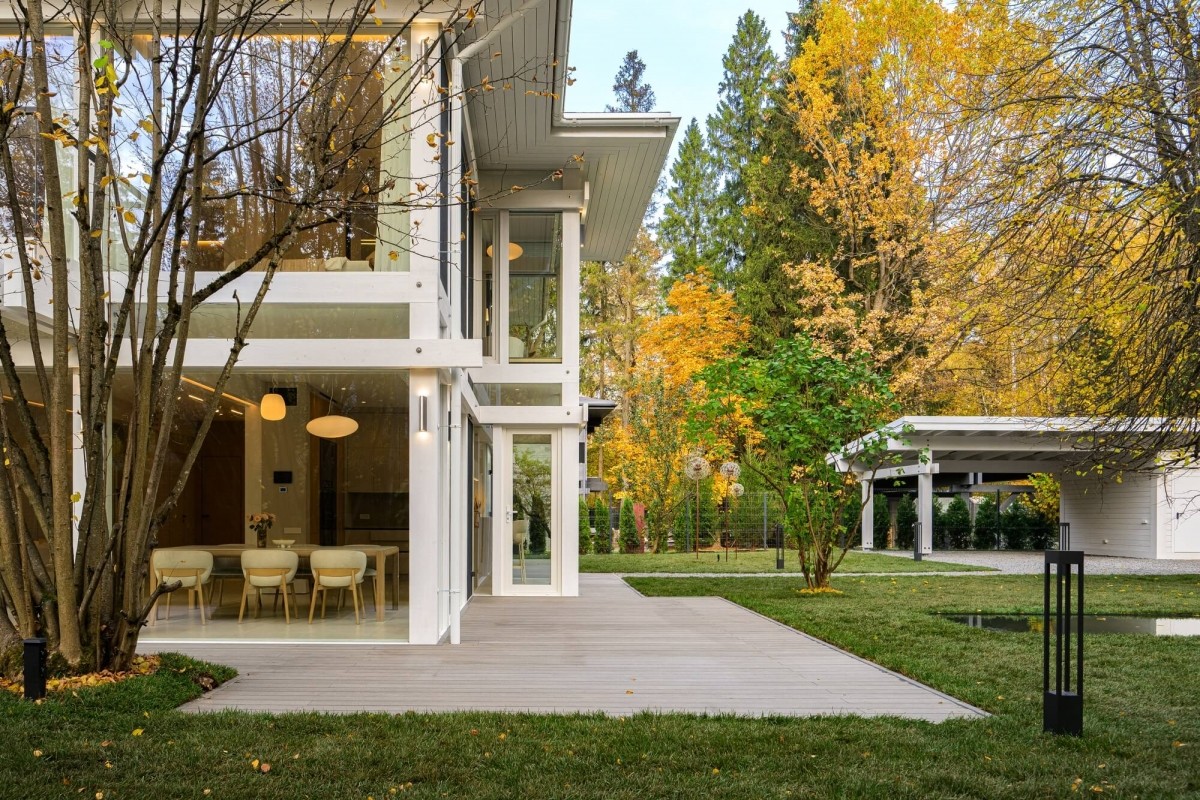 Стеклянные стены от пола до потолка, потрясающие виды на собственный сад, высокие потолки, высококачественная отделка, эксклюзивное цветовое решение стен, монолитное межэтажное перекрытие и как следствие -отсутствие «торчащих» батарей, межкомнатные стены из пазогребневых блоков.