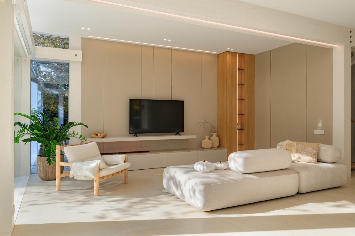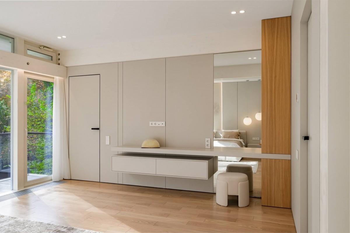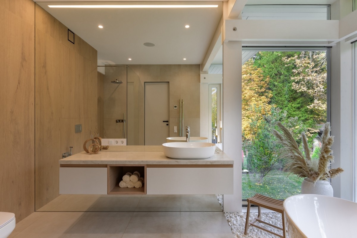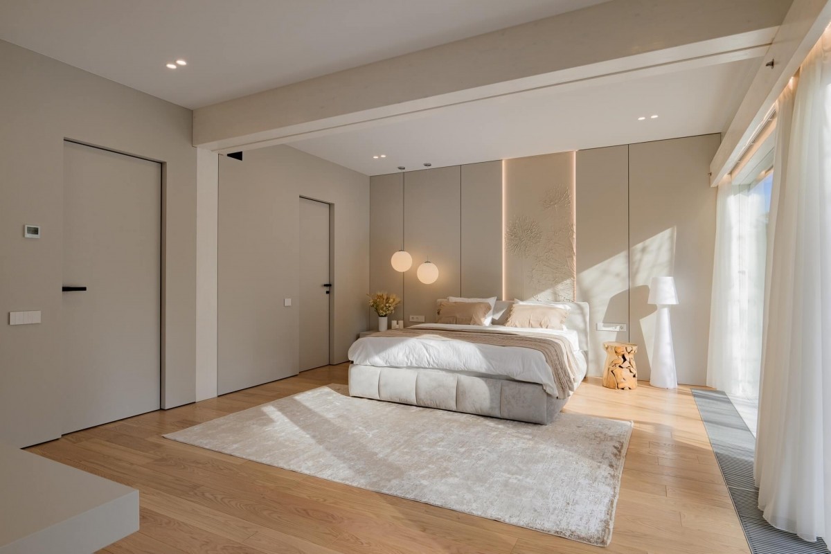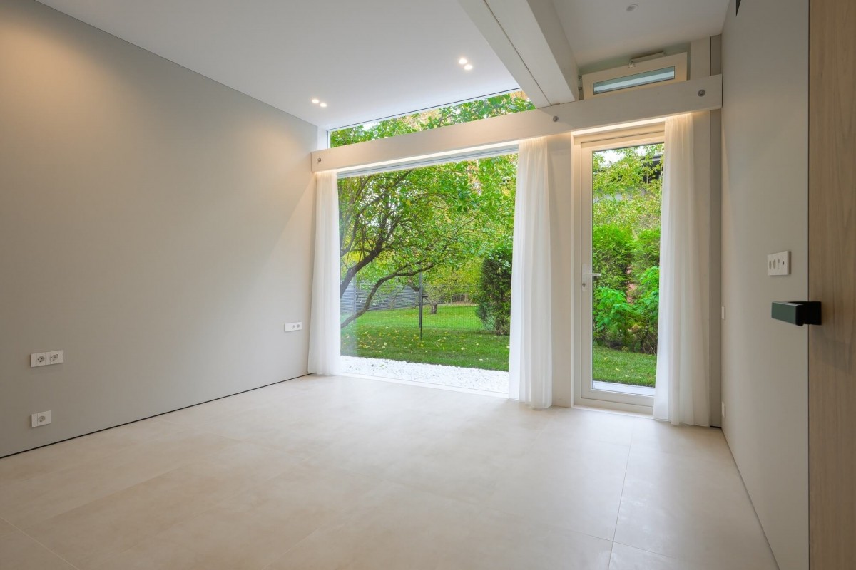 Стеклянные стены от пола до потолка, потрясающие виды на собственный сад, высокие потолки, высококачественная отделка, эксклюзивное цветовое решение стен, монолитное межэтажное перекрытие и как следствие -отсутствие «торчащих» батарей, межкомнатные стены из пазогребневых блоков.