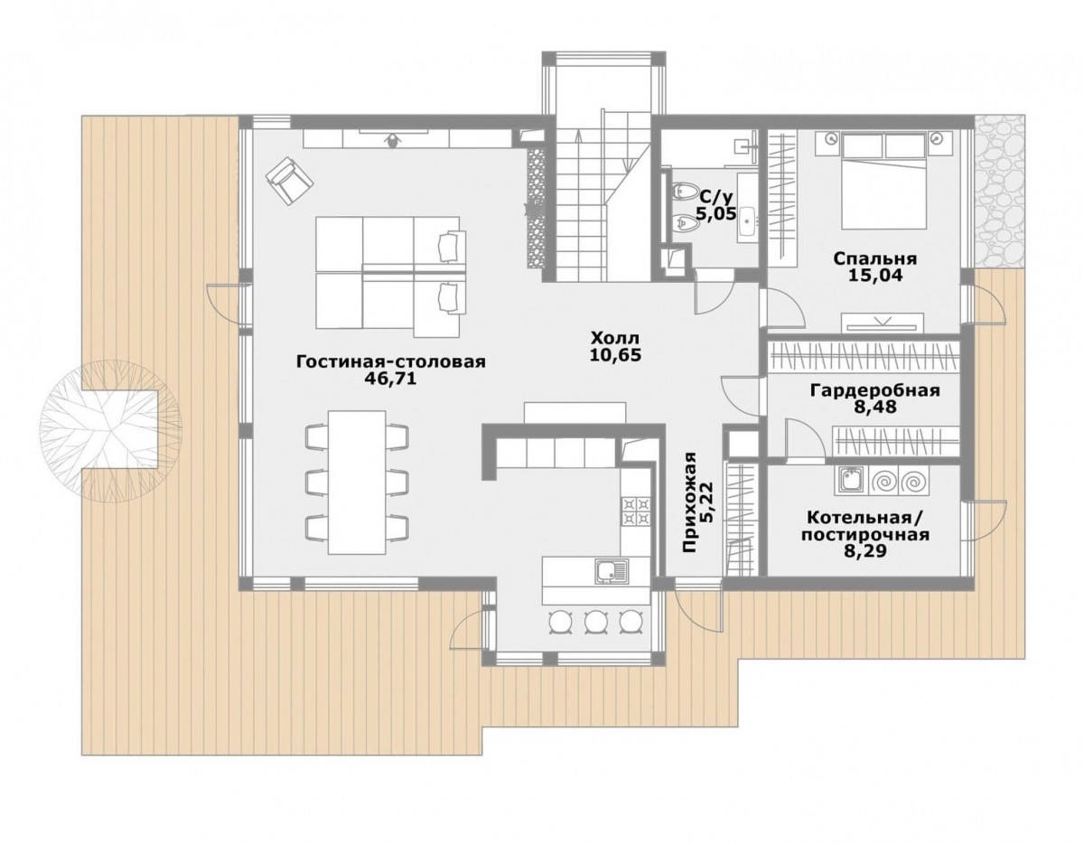 1 этаж: прихожая (5,2), холл (10,7), гардеробная (8,5), гостевой с/у (5,1), гостиная-столовая (46,7), гостевая спальня (15), котельная-постирочная (8,3).