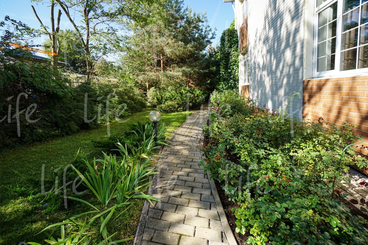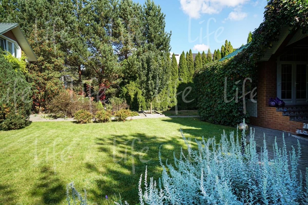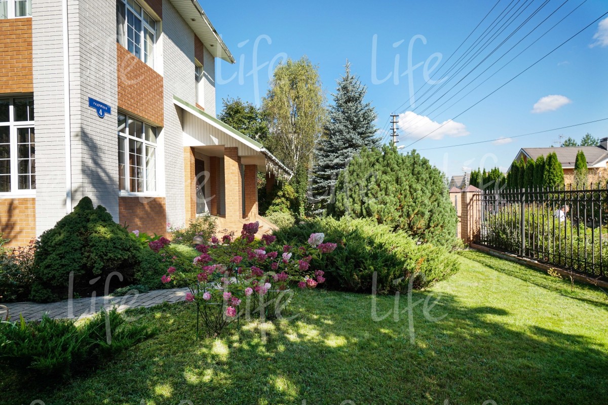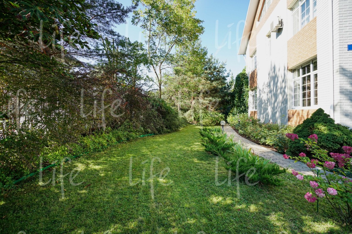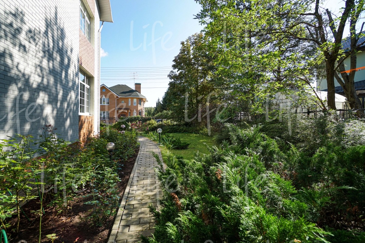 На придомовой территории выполнен ландшафтный дизайн: высажено множество взрослых лесных и плодовых деревьев, цветов и кустарников, есть сухой ручей, альпийская горка, зона барбекю и