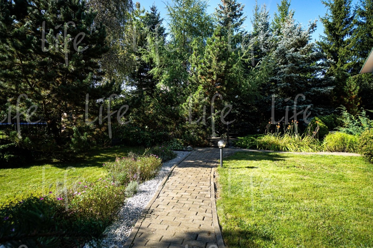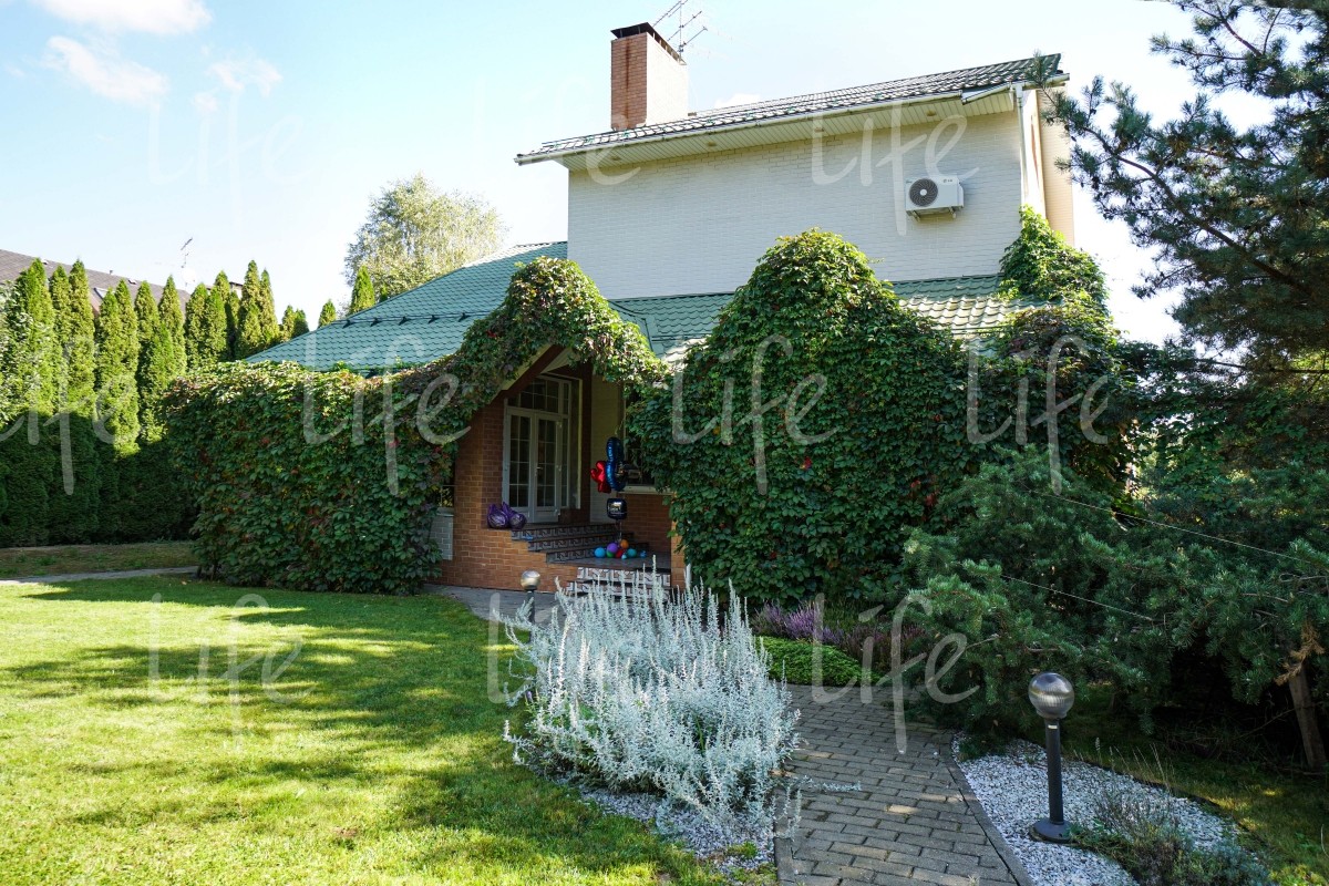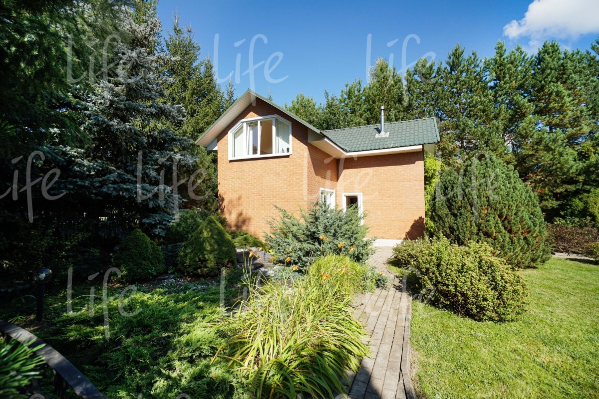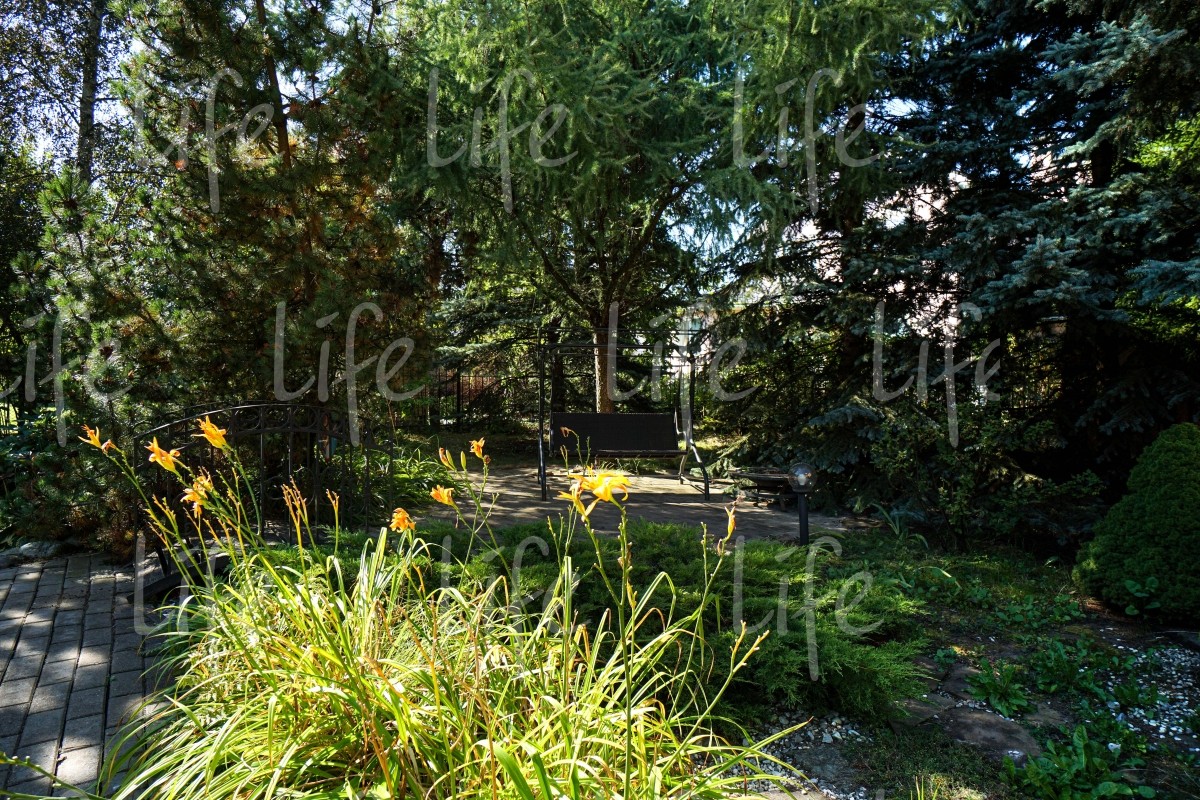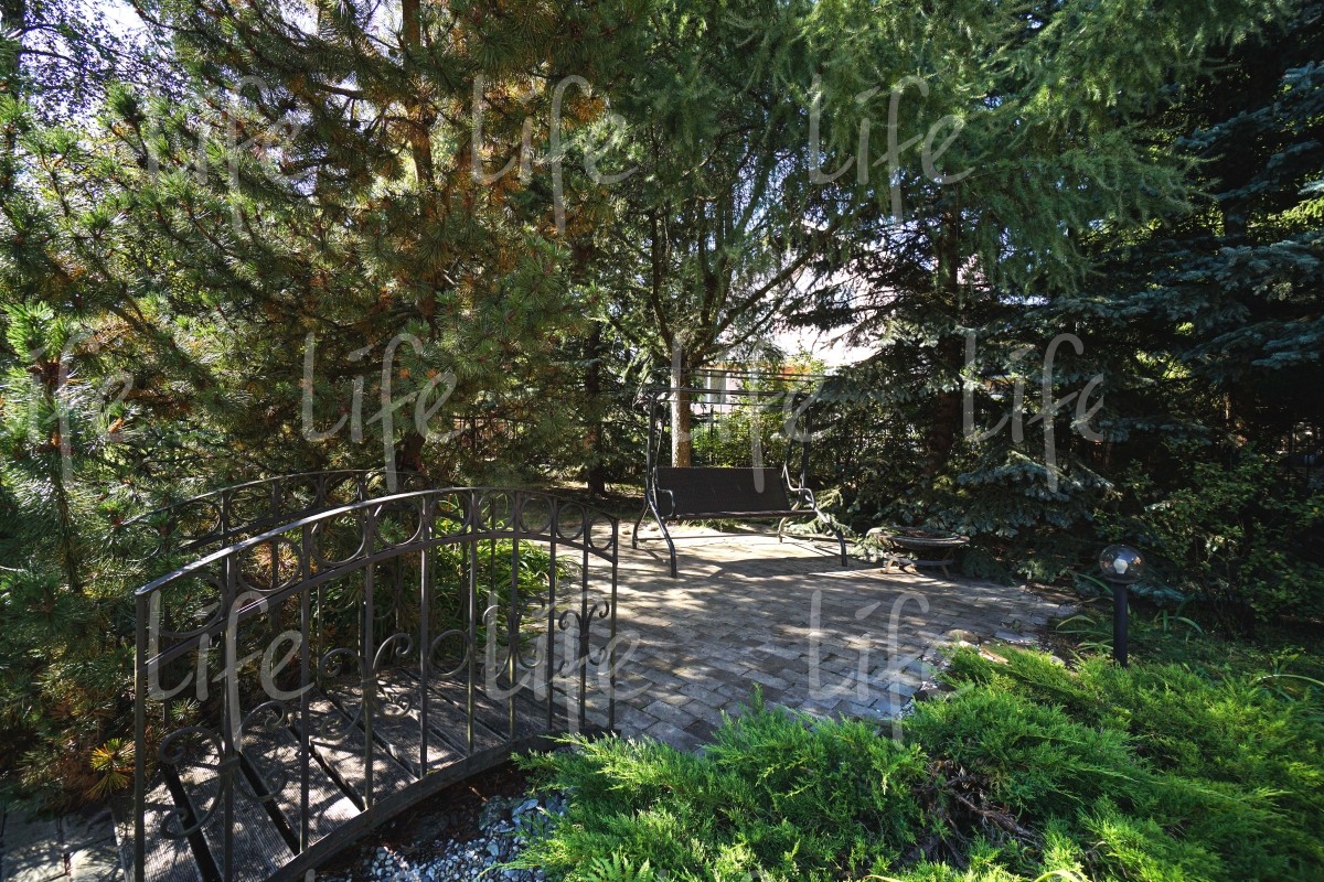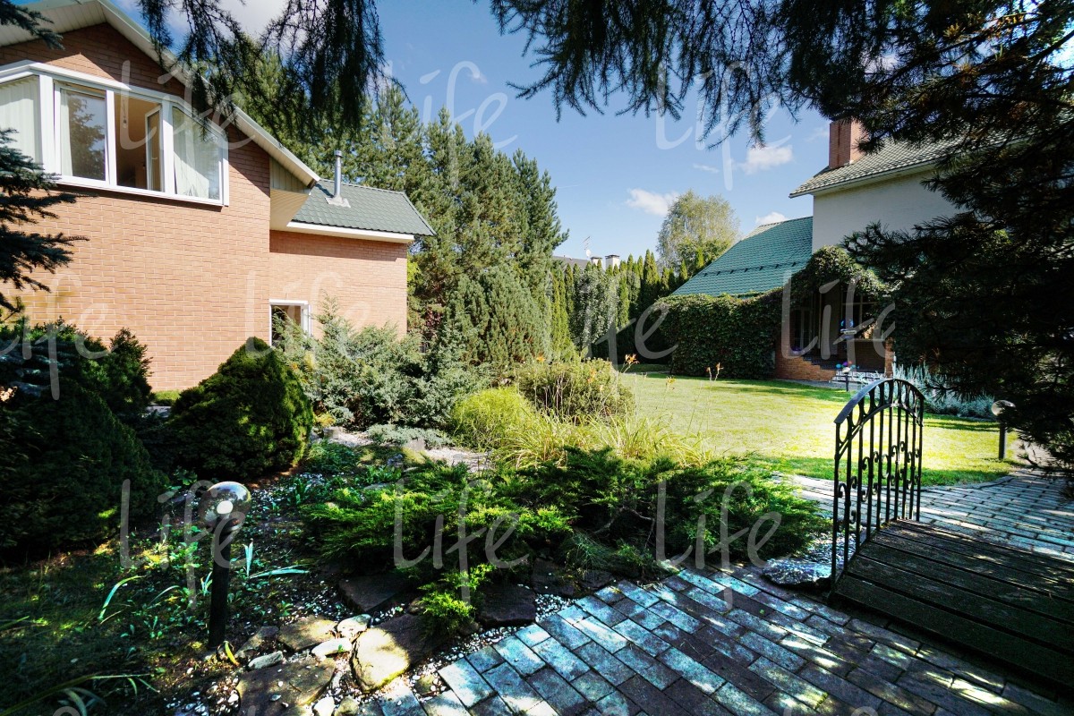 На придомовой территории выполнен ландшафтный дизайн: высажено множество взрослых лесных и плодовых деревьев, цветов и кустарников, есть сухой ручей, альпийская горка, зона барбекю и