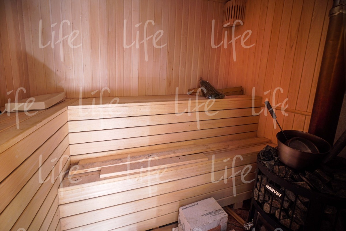 На участке двухэтажный гостевой дом в едином стиле с основным домом. В нём – спа-зона и квартира для персонала.