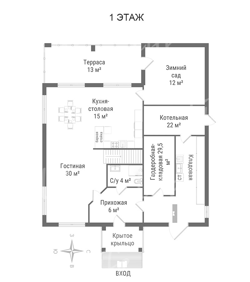 1 этаж: прихожая, су, гостиная, кухня-столовая, терраса, зимний сад, котельная, гардеробная, кладовая.