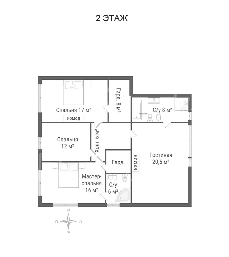 2 этаж: гостиная с камином, мастер-спальня с су и гардеробной, 2 спальни, гардеробная, холл, су.мастер-спальня с су и гардеробной, кладовые.