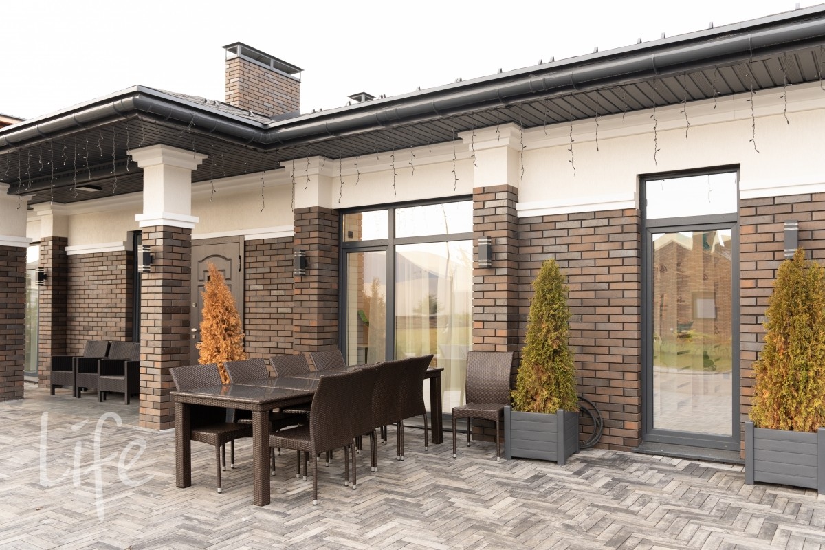 Стены: керамические блоки ЛСР с признанным утеплителем — пеностекольным щебнем, обеспечивающим превосходную теплоизоляцию и экологичность. Фасадный отделан облицовочным кирпичом Braer Pro — эстетика, надежность и защита на расстоянии вперед.