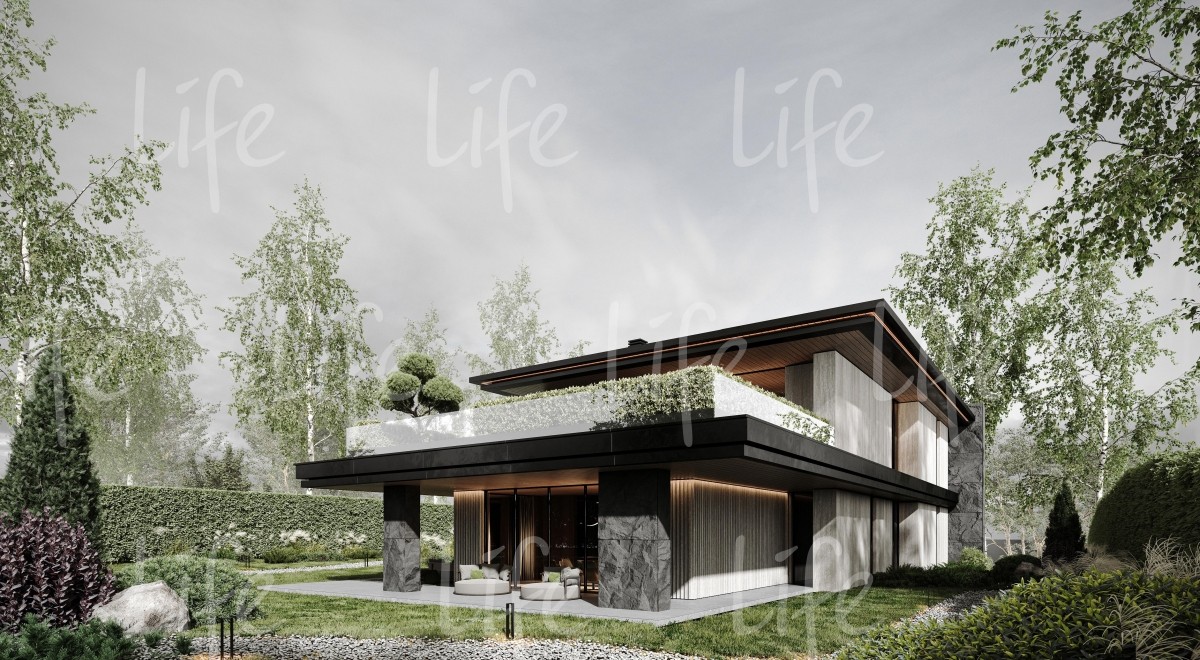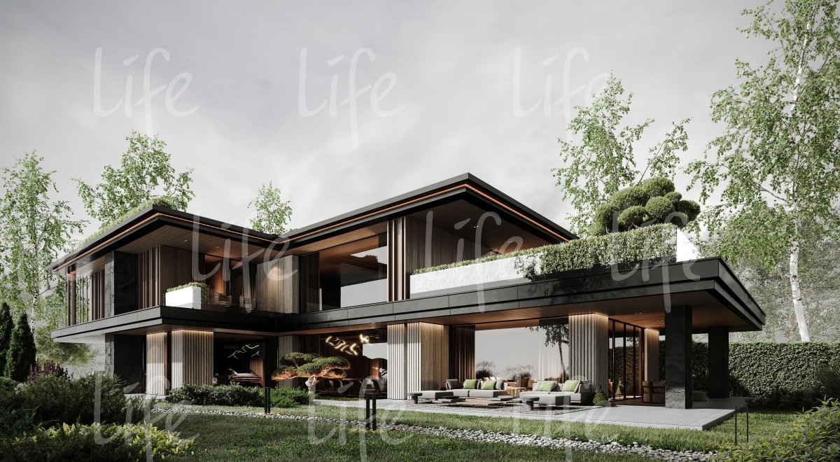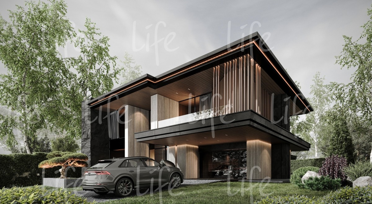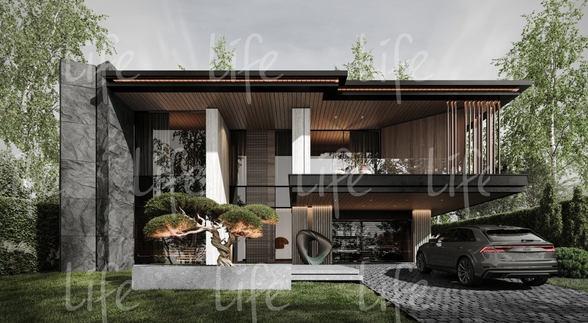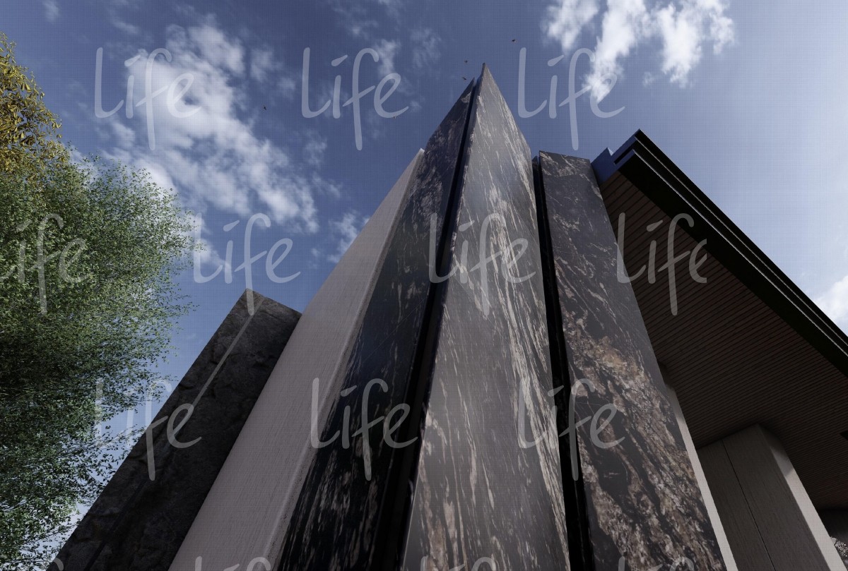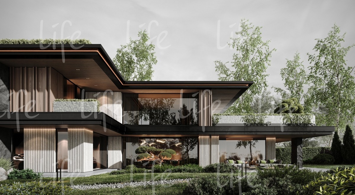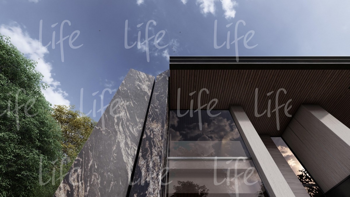 Архитектура здания выполнена в современном стиле с панорамным остеклением и комбинацией натурального гранита с термодеревом на фасаде. Есть архитектурная подсветка фасада.