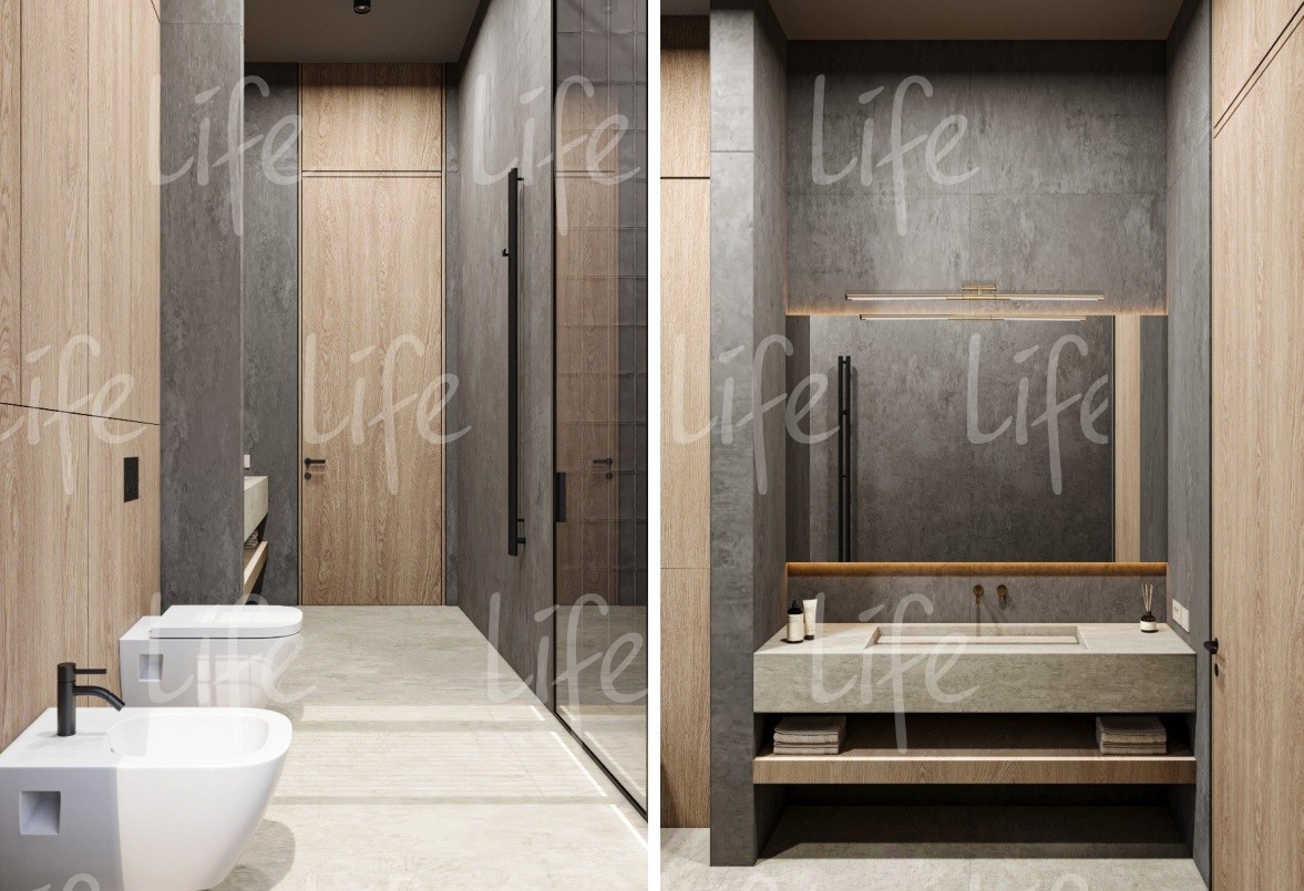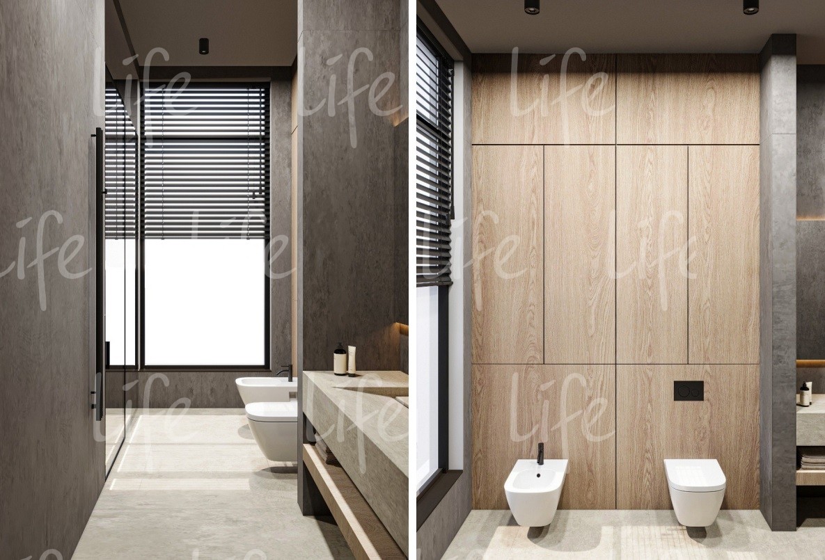 1 этаж: прихожая, гардеробная, холл, постирочная, гардеробная, четыре спальни, три санузла, гостиная-кухня-столовая, постирочная, котельная, гараж на два автомобиля.