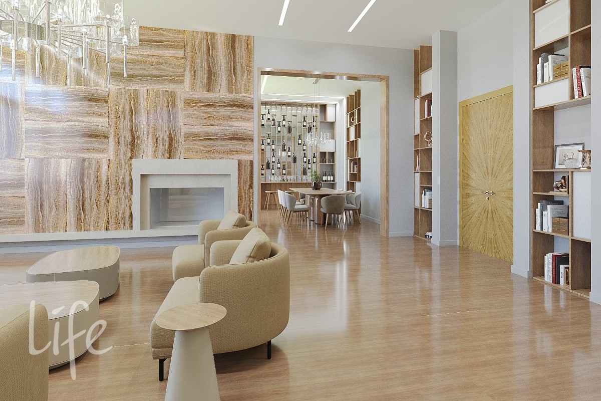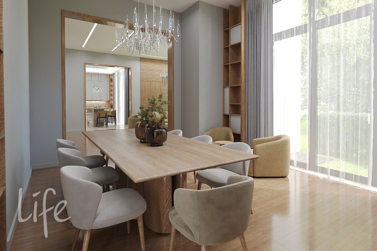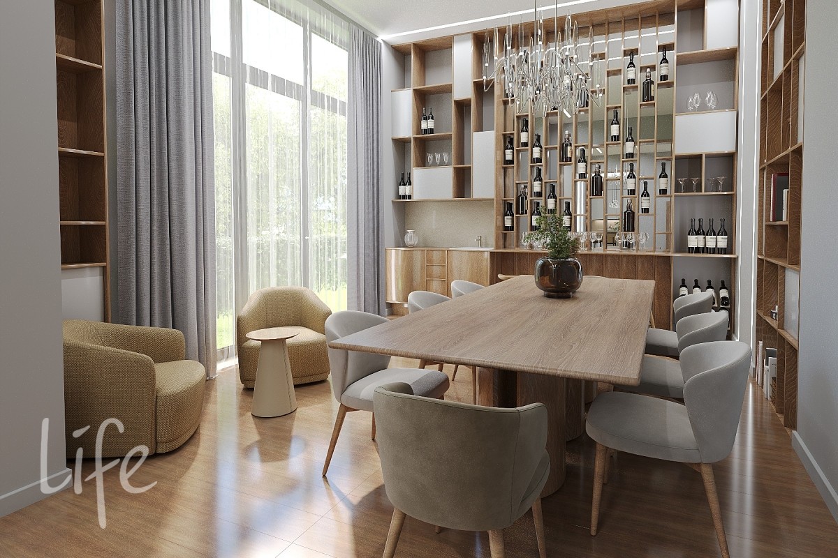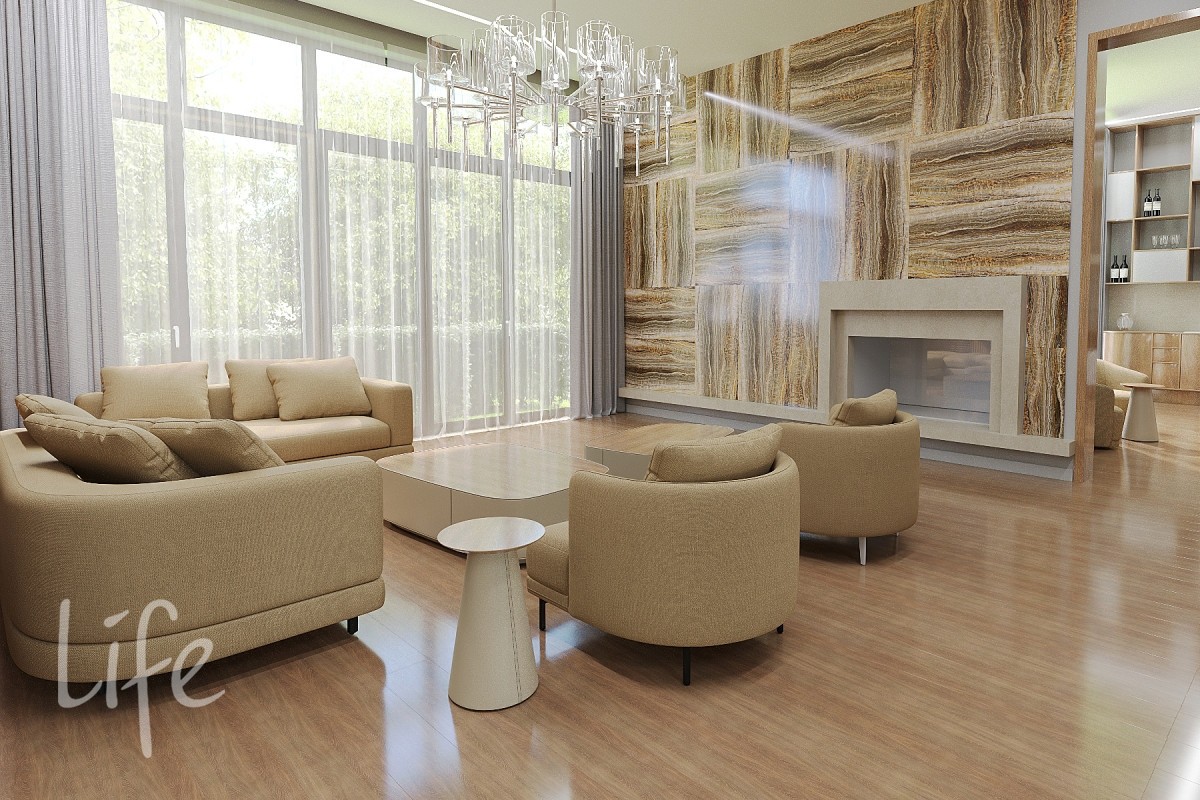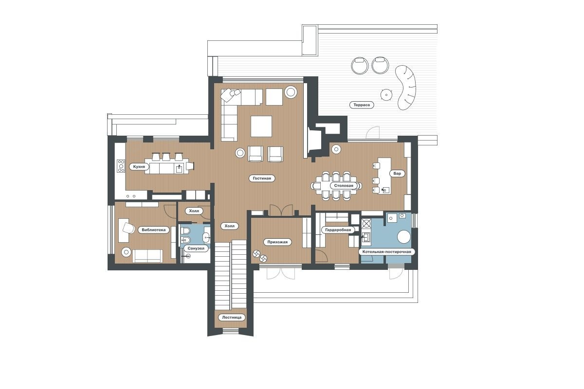 1 этаж: прихожая, гардеробная, санузел, холл, кухня, столовая с выходом на террасу, бар, гостиная с камином, кабинет.