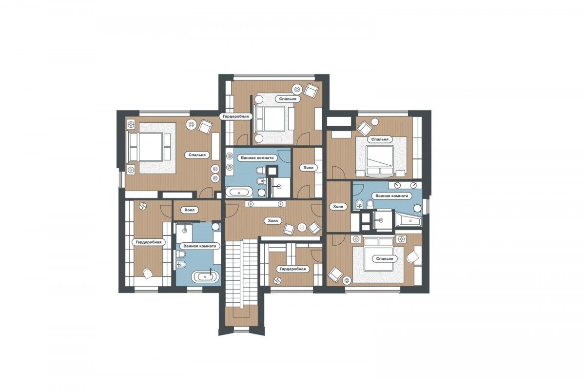 2 этаж: холл, мастер - спальня с санузлом и гардеробной, спальня с гардеробной и санузлом, детская спальня с гардеробной и санузлом, спальня.
