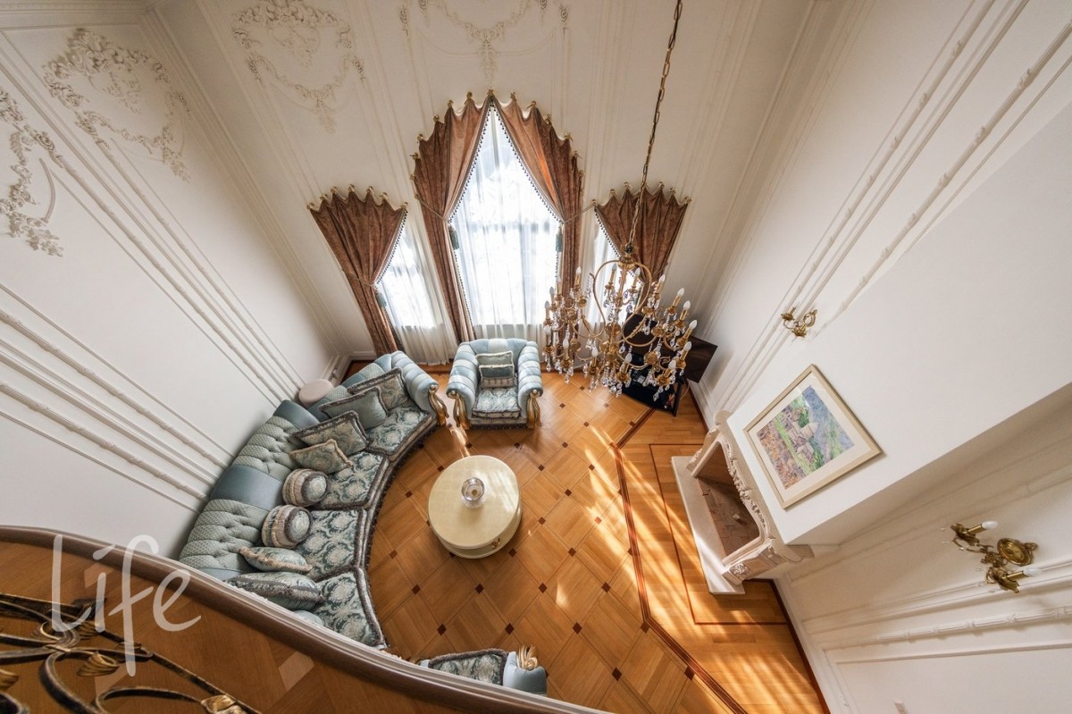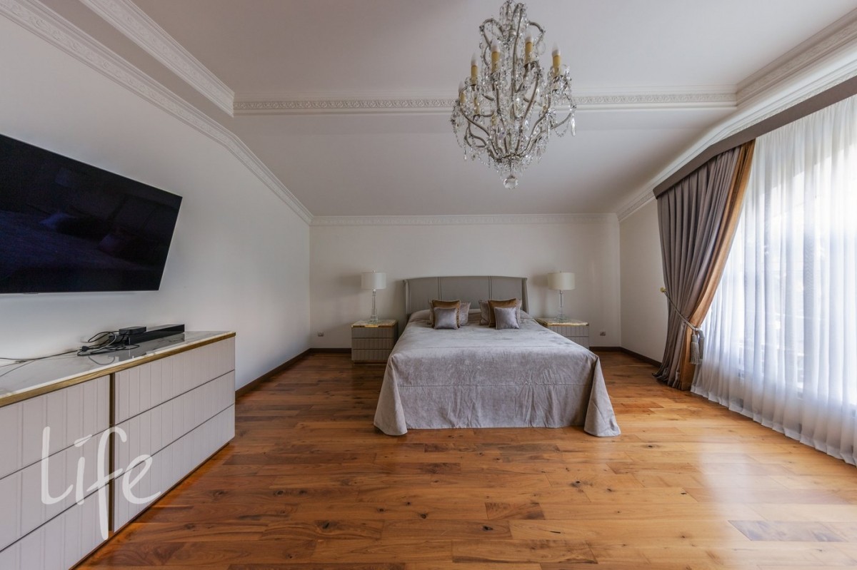 Четырехэтажный дом в классическом стиле на большом участке. Обратите внимание на большое количество пространства для отдыха и даже собственная игровая зона для детей. Благодаря небольшому склону на участке не задерживается вода и снег.