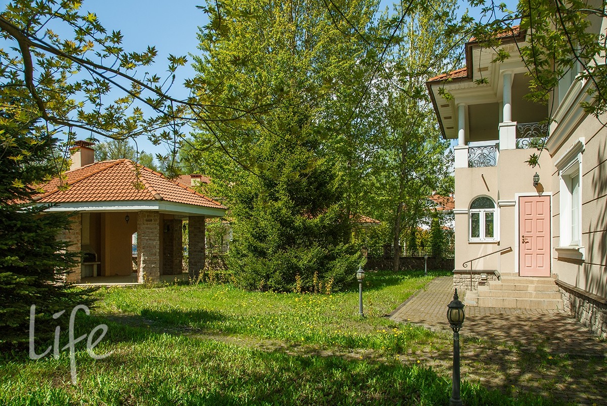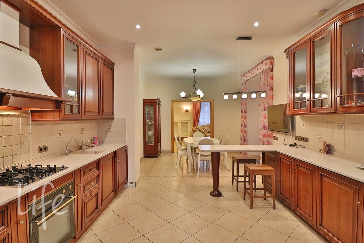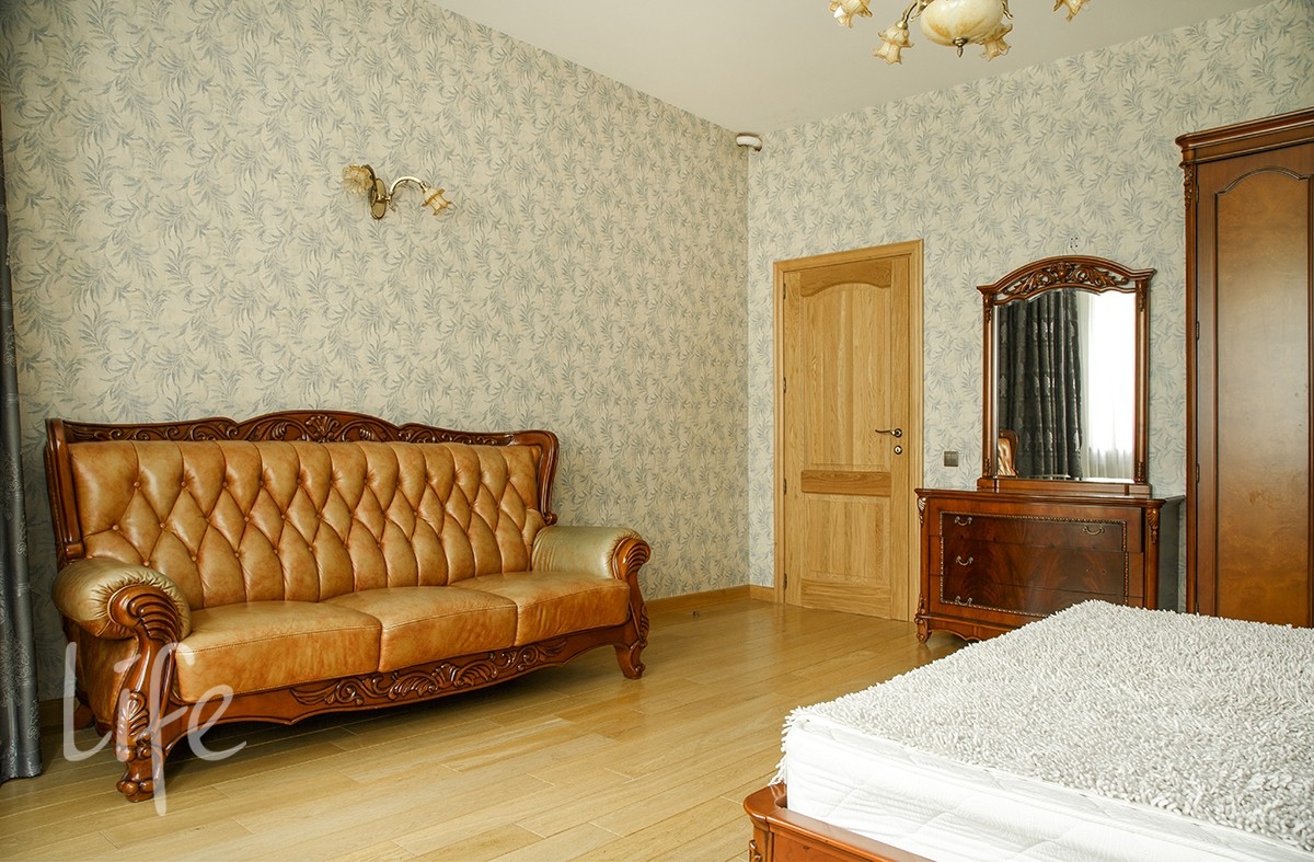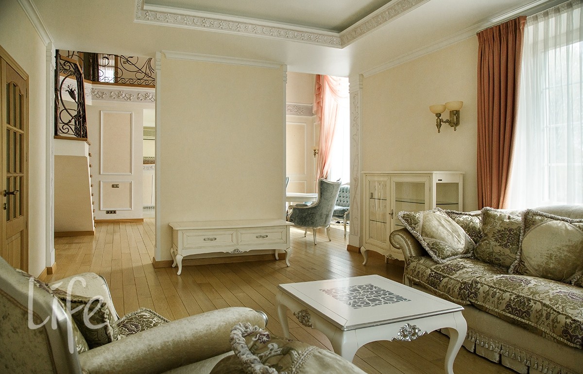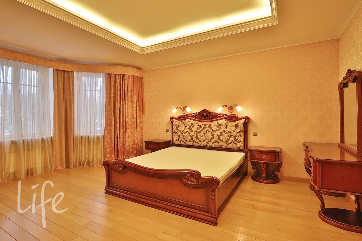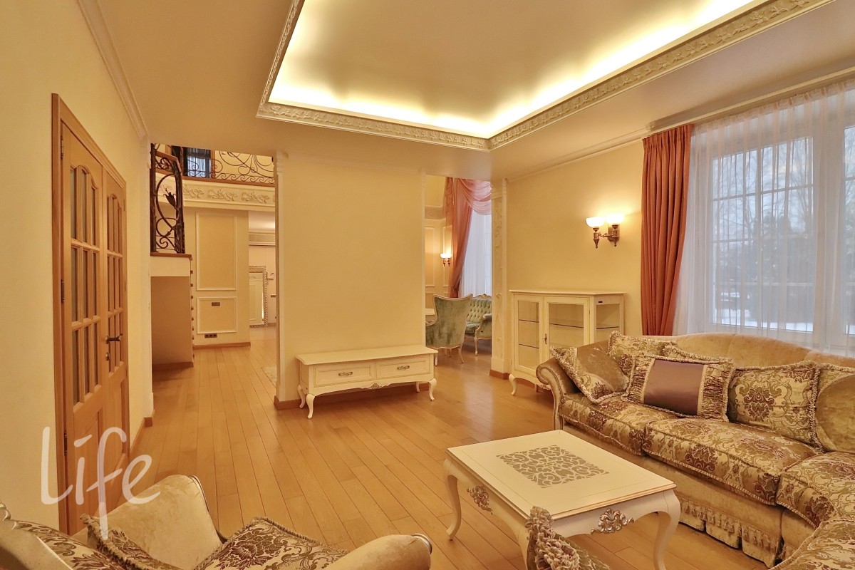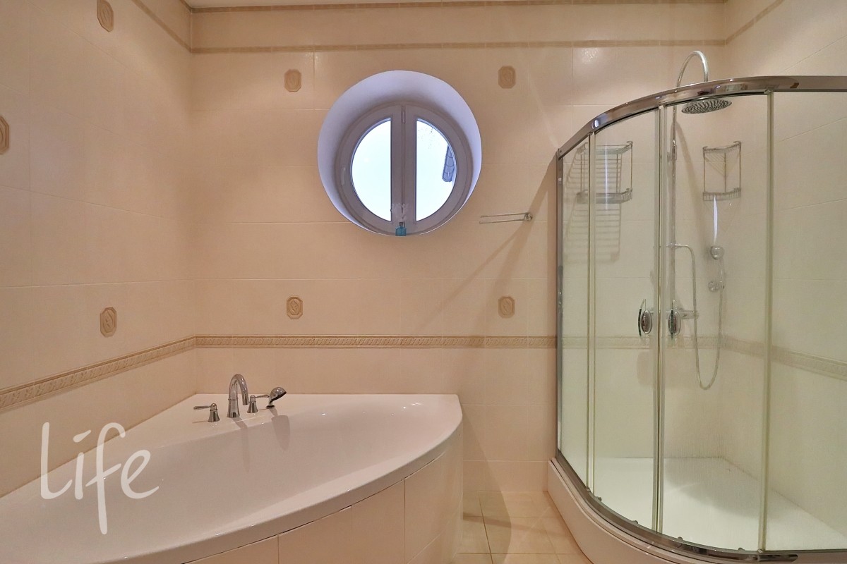 Интерьер выполнен в классическом стиле в светлых пастельных тонах. Вся мебель — итальянская, а бытовая техника — от премиальных брендов. Планировка дома очень удобная, а все коммуникации проведены централизованно. Установлены кондиционер и система встроенного пылесоса.