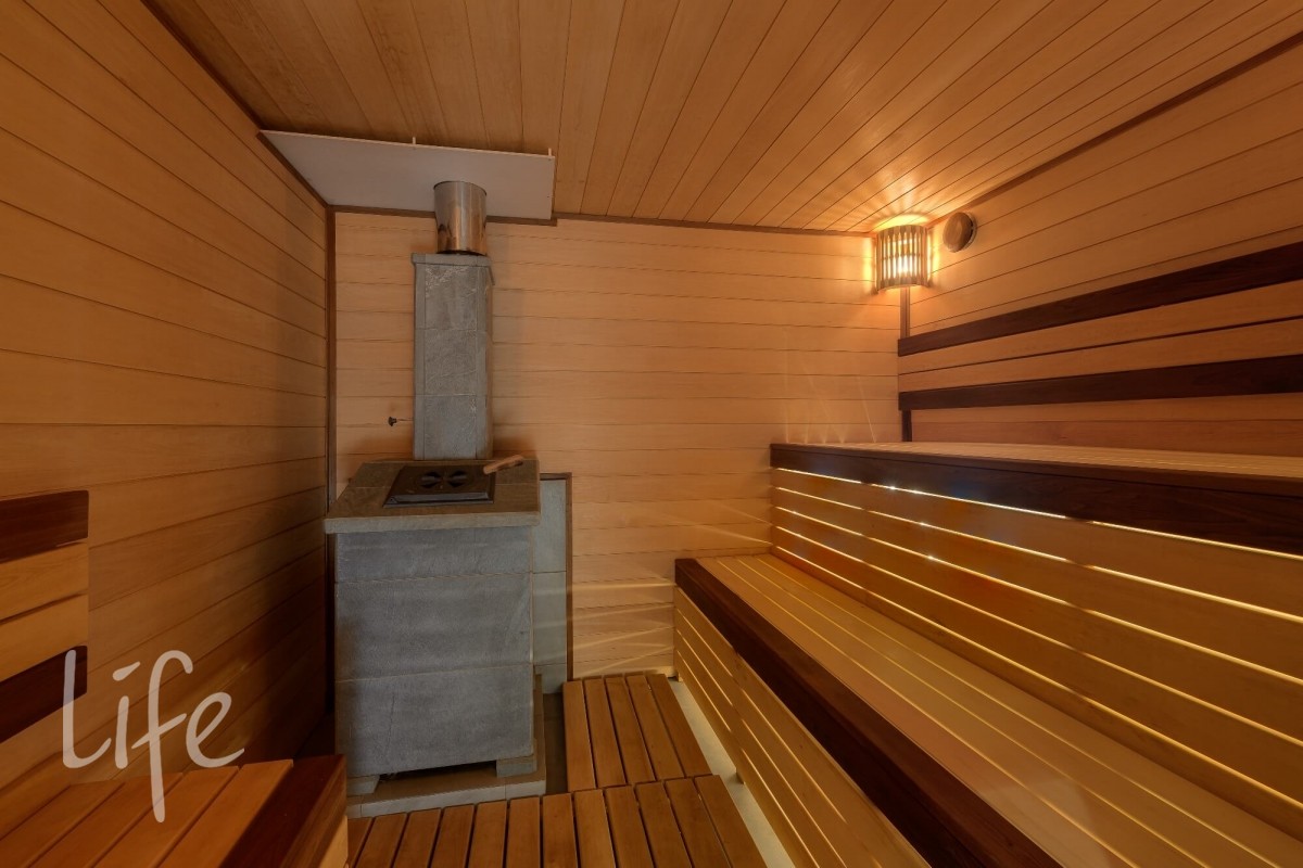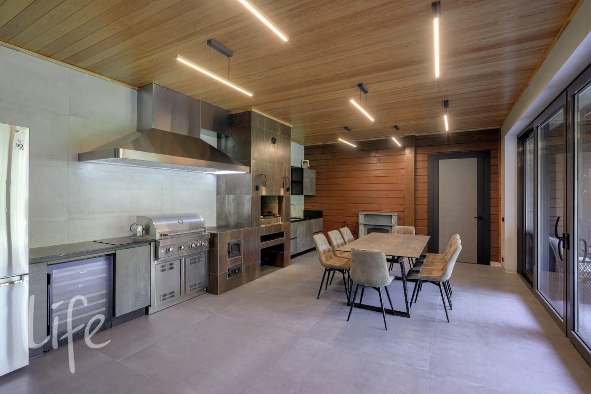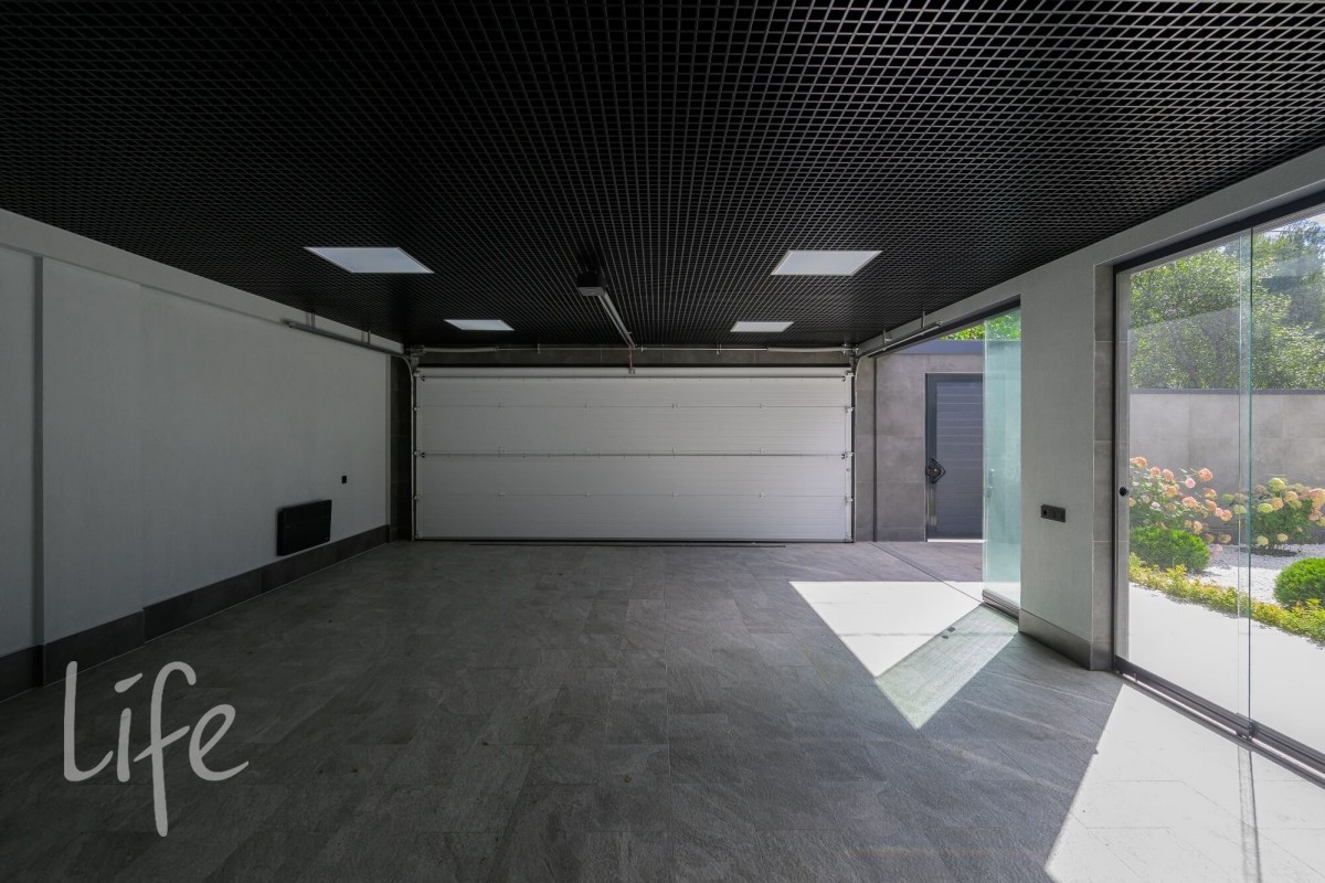 На участке расположен основной дом, который архитектурно объединен второй гостиной с большой баней из клееного бруса (429 кв.м), гараж на 2 м/м с раздвижной стенкой из стекла (35 кв.м), отапливаемый хоз.блок с двумя помещениями (15 кв.м) и аутентичный колодец с питьевой водой.