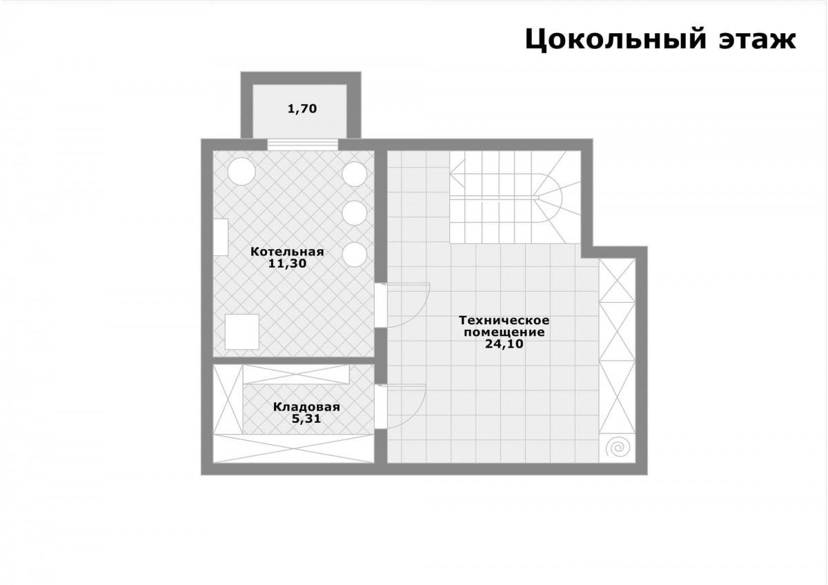 Цоколь: котельная (11,3), кладовая (5,31), помещение свободного назначения (24,1).