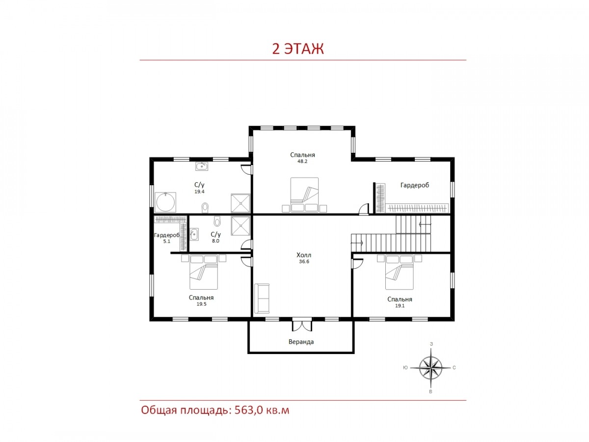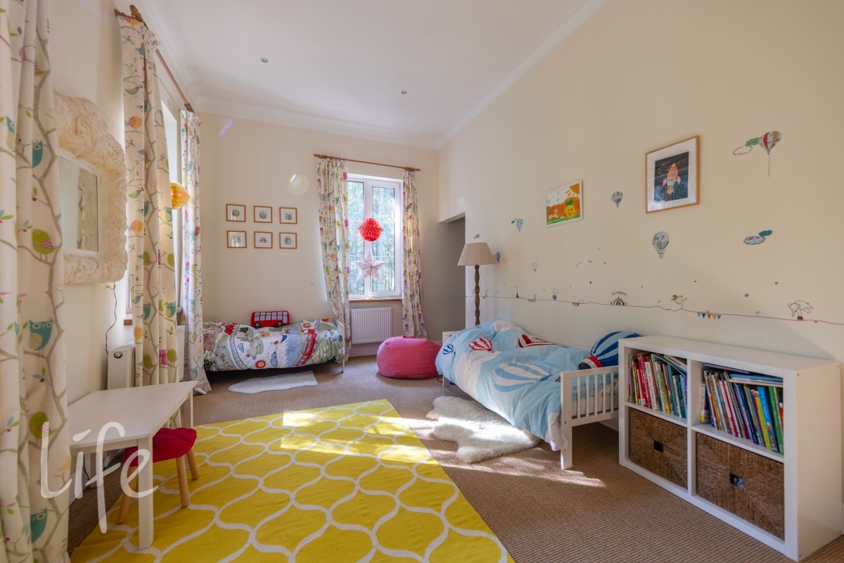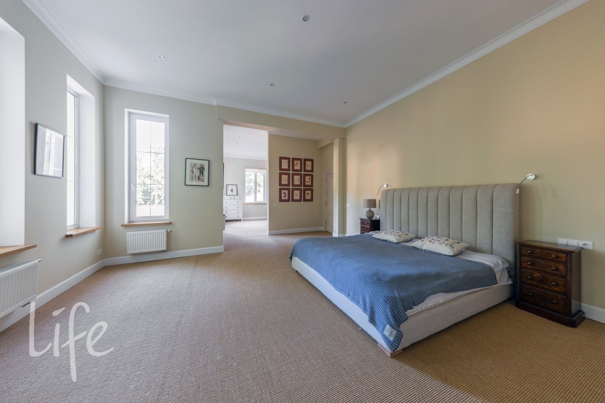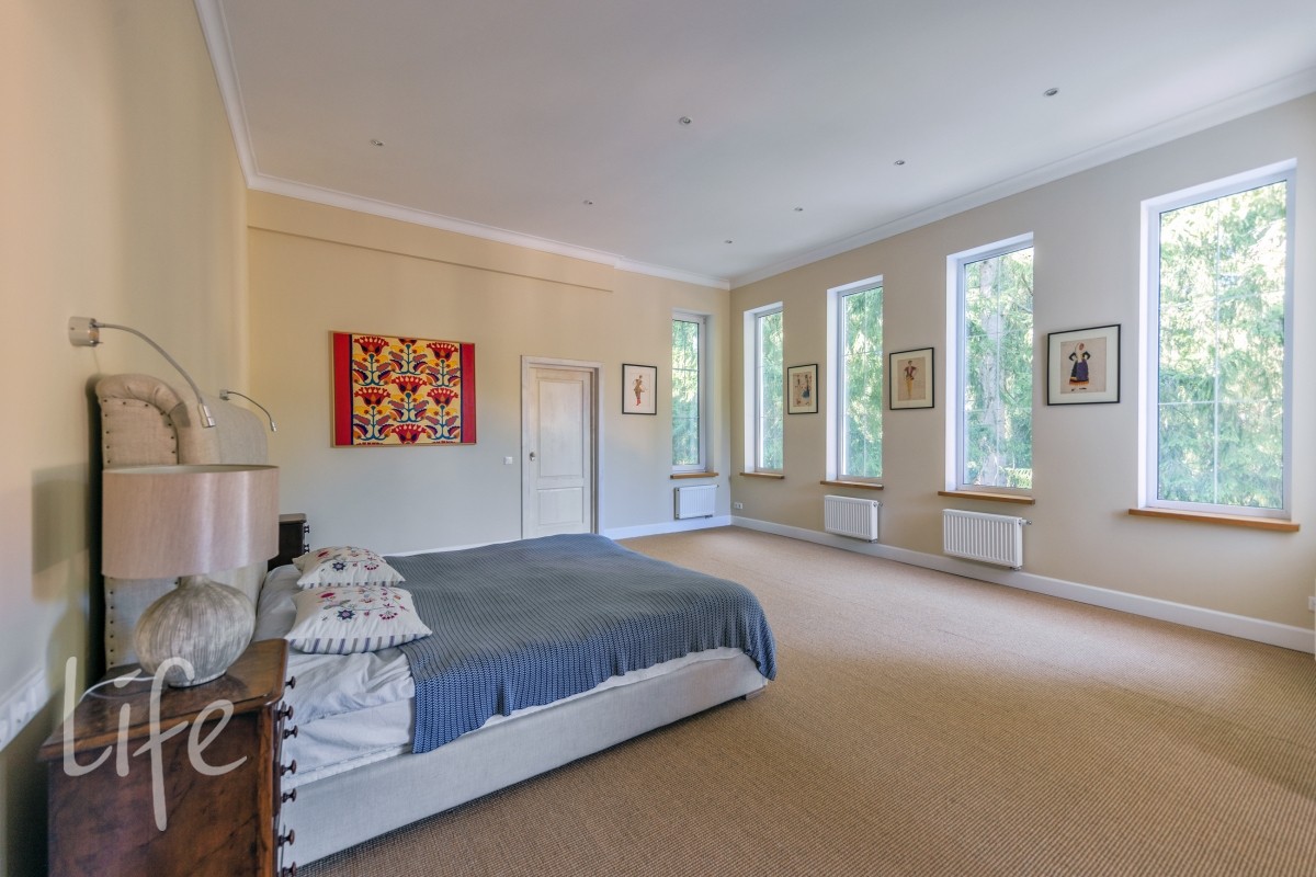 2 этаж: просторная мастер-спальня с ванной комнатой и гардеробной, большой холл-библиотека с выходом на балкон, две детские спальни, ванная комната.