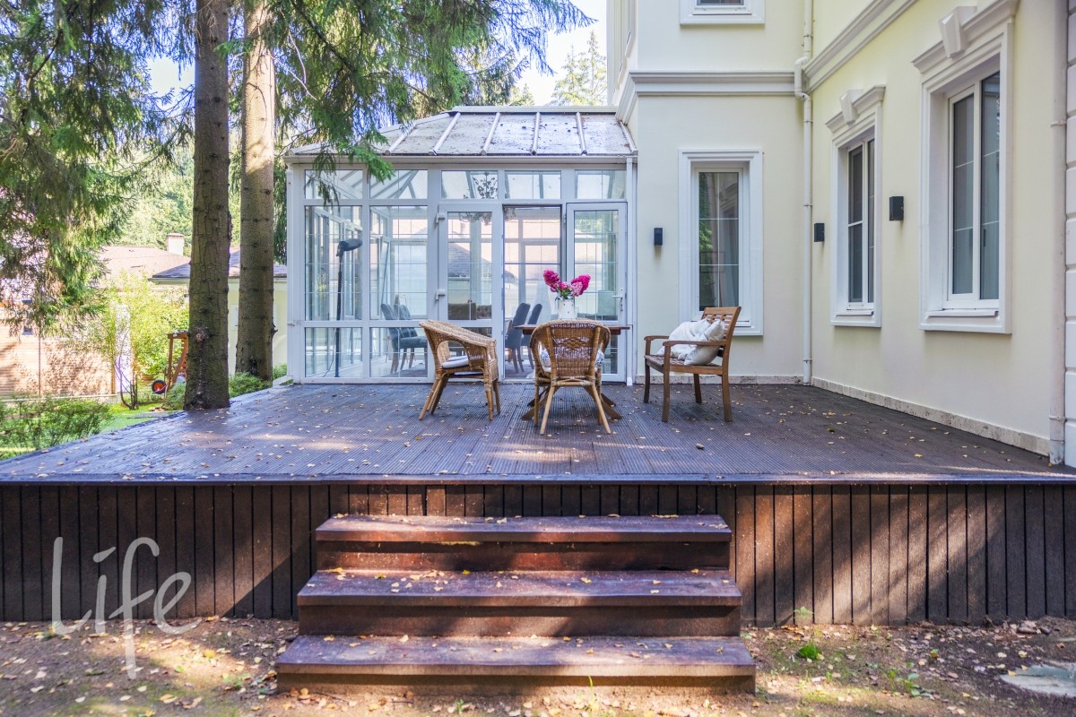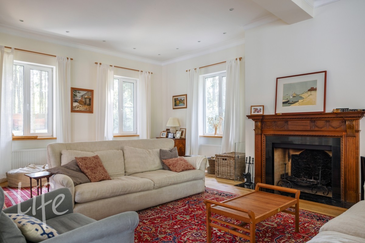 1 этаж: уютная гостиная с большим камином и антикварным английским деревянным порталом, современная кухня, объединённая с гостиной, отапливаемый зимний сад и просторная летняя терраса с летней мебелью и выходом в сад, ванная комната с сауной, бочкой и гостевым су.
