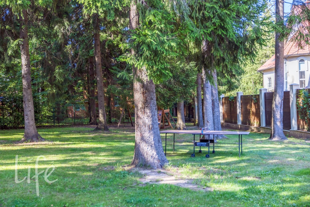 На участке оборудована деревянная детская площадка, теннисный стол, зона для отдыха, небольшой аптекарский огород, клумбы с цветами и ухоженный газон.