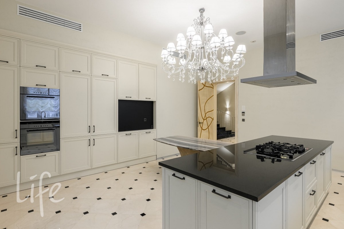 1 этаж: просторная светлая гостиная с отдельной каминной зоной, большая функциональная кухня с островом, оснащенная швейцарской техникой V-Zug, входной холл с великолепной парадной лестницей и акцентной люстрой с кристаллами Swarovski от итальянского ателье Beby Group, бассейн 10 м с противотоком на премиальном оборудовании Olуmpic с панорамным остеклением и живописным видом на лес, помещение для установки сауны или хаммама.