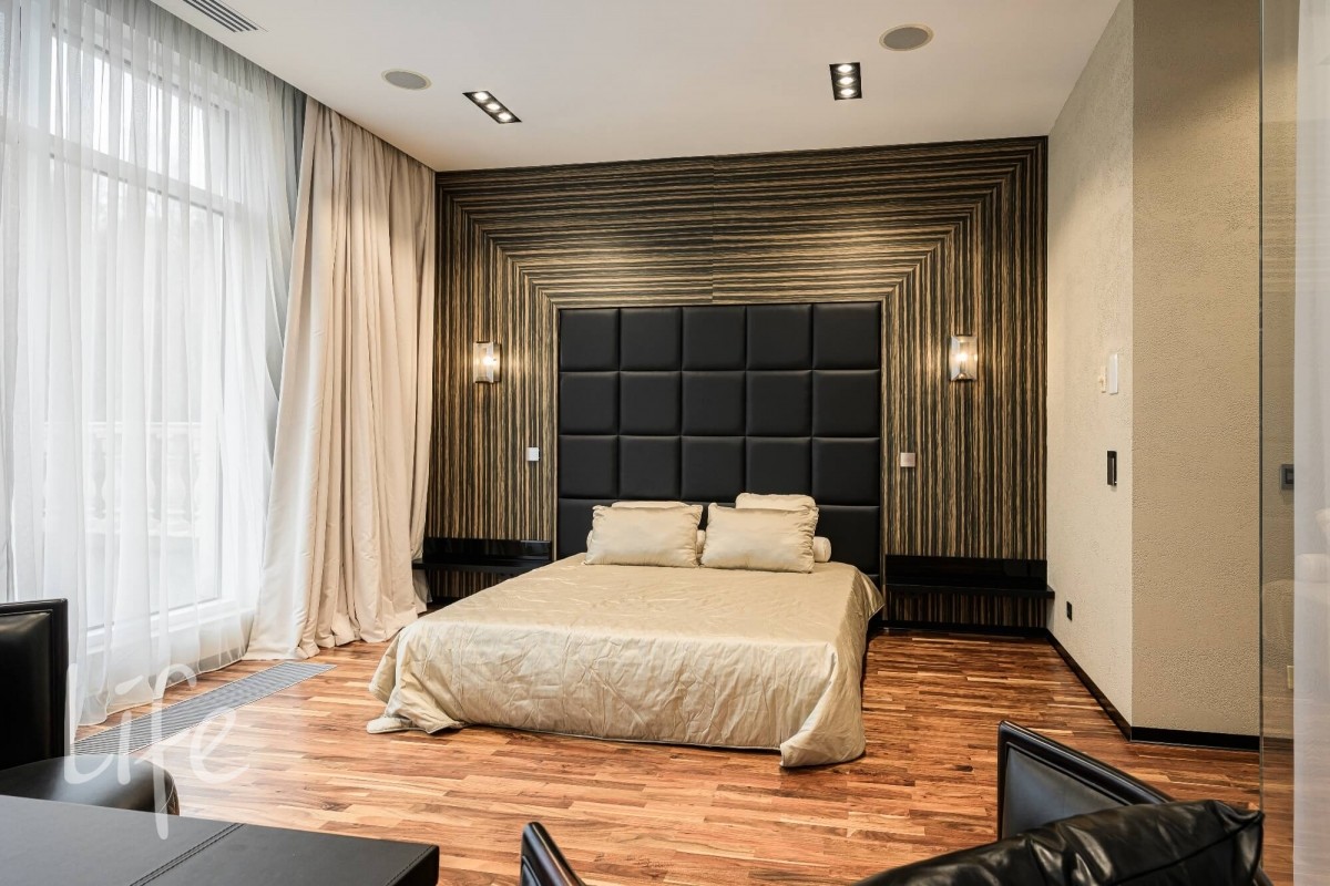 Благодаря высоким потолкам и панорамному остеклению в доме много воздуха и света. Над проектом работал профессиональный архитектор, выполнен дорогой и качественный ремонт, в отделке использованы ценные экзотические породы дерева и натуральный мрамор.