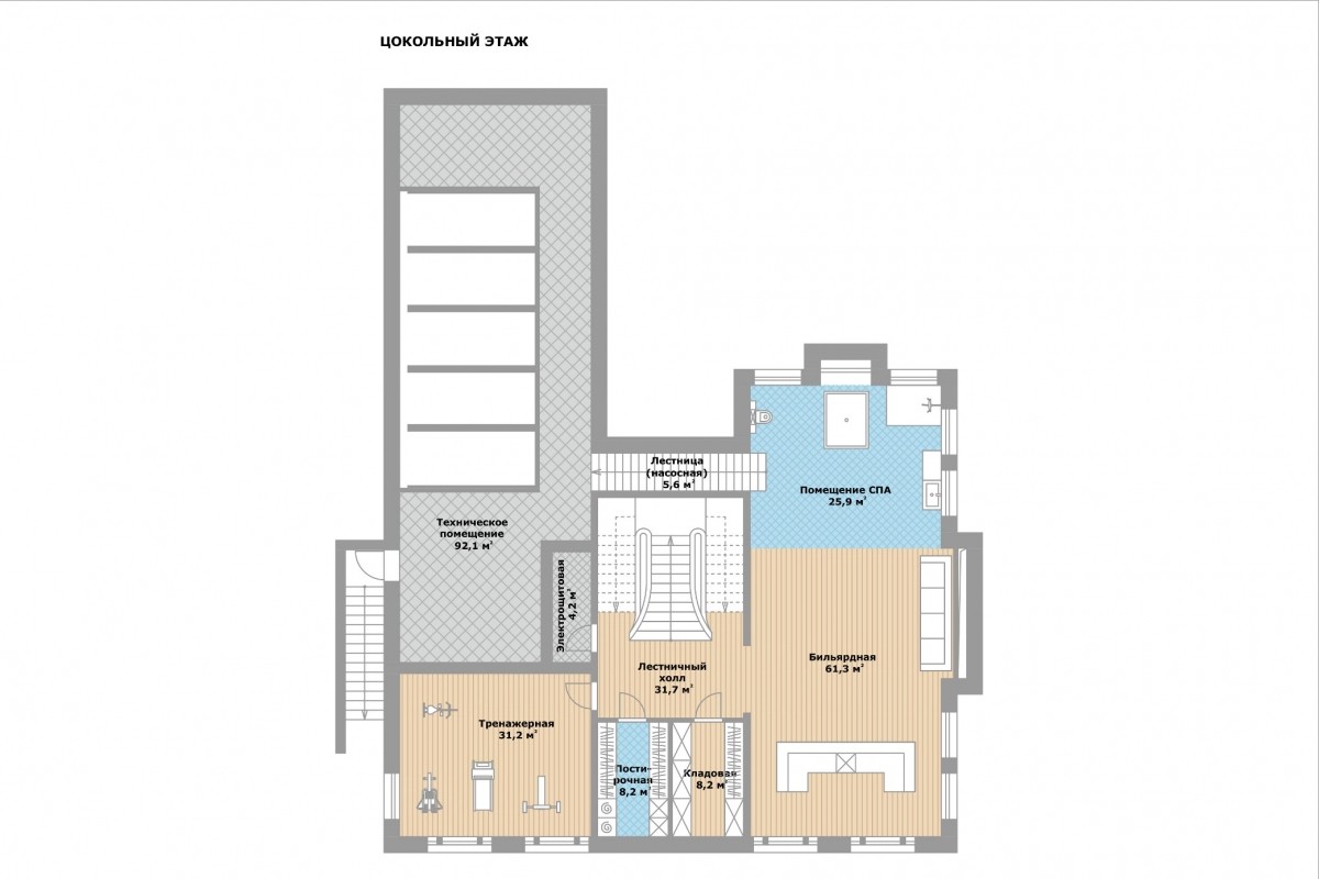 Цоколь: джакузи и комната отдыха площадью 87 кв.м с барной стойкой, выполнена подготовка для домашнего кинотеатра, тех.помещение бассейна, тренажерный зал, постирочная и кладовая.