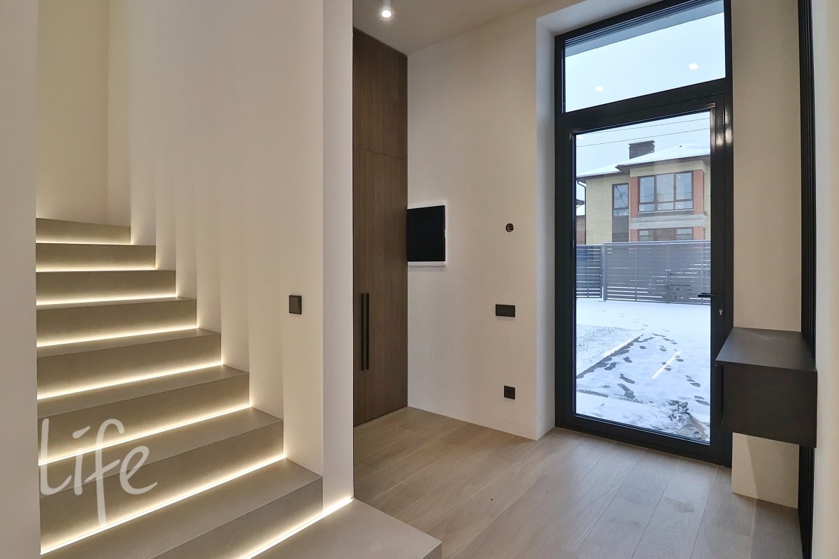 Интерьер выполнен в современном стиле, в светлых, мягких тонах. Дом всегда полон света, даже в пасмурные дни, благодаря большой площади остекления. Современная система освещения.