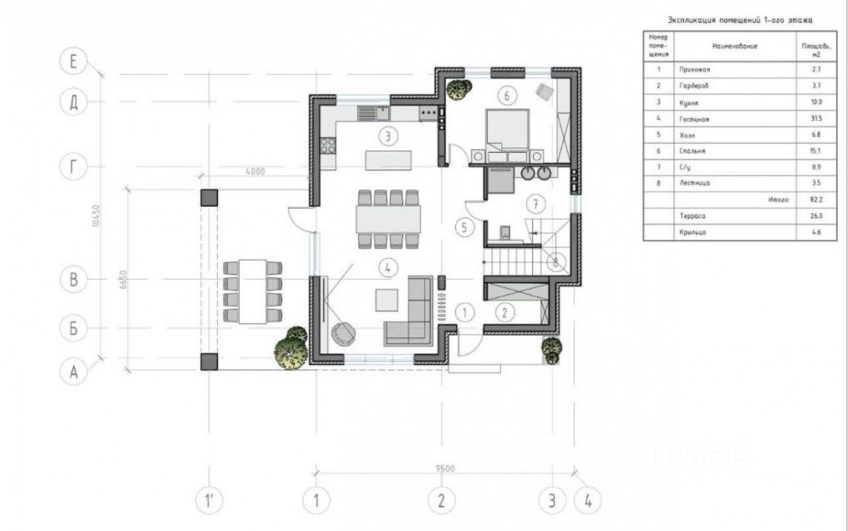 1 этаж: прихожая, гостиная-кухня-столовая с выходом на летнюю террасу с зоной барбекю, с/у, спальня.