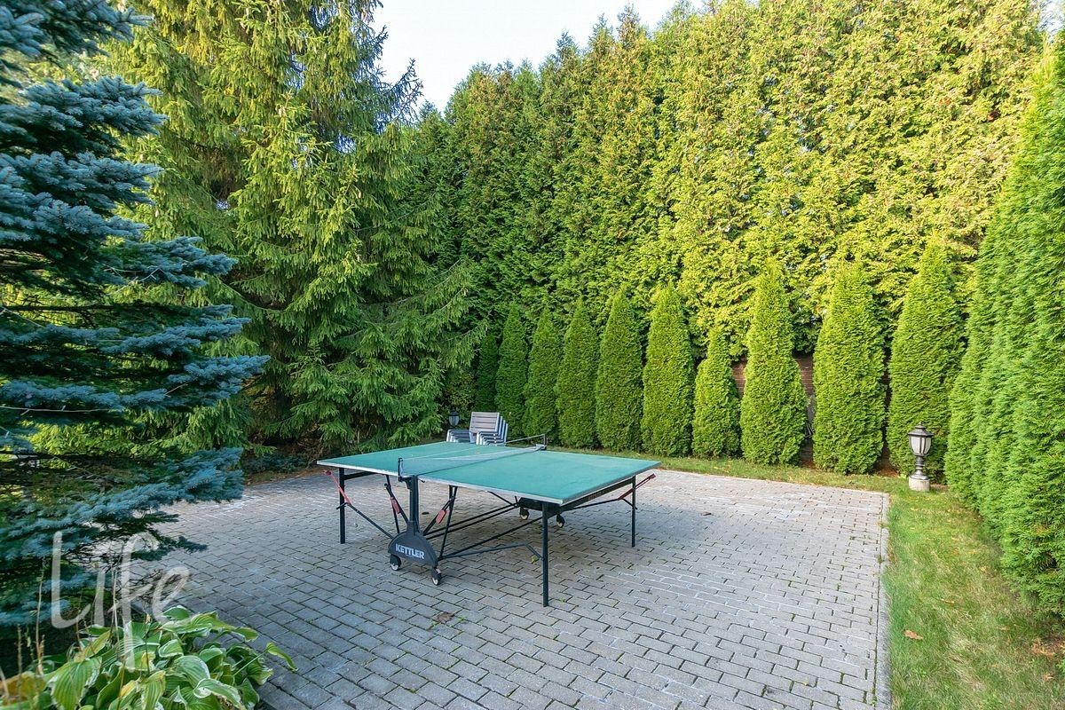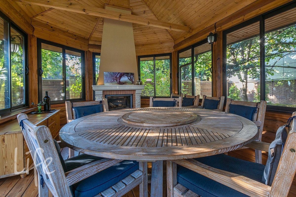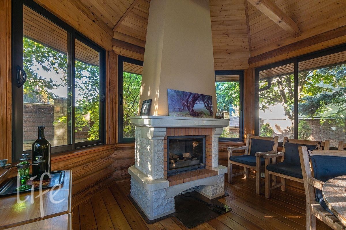 Участок с ландшафтным дизайном. На участке имеется красивая застекленная беседка с камином. Для инструментов предусмотрен хозблок.