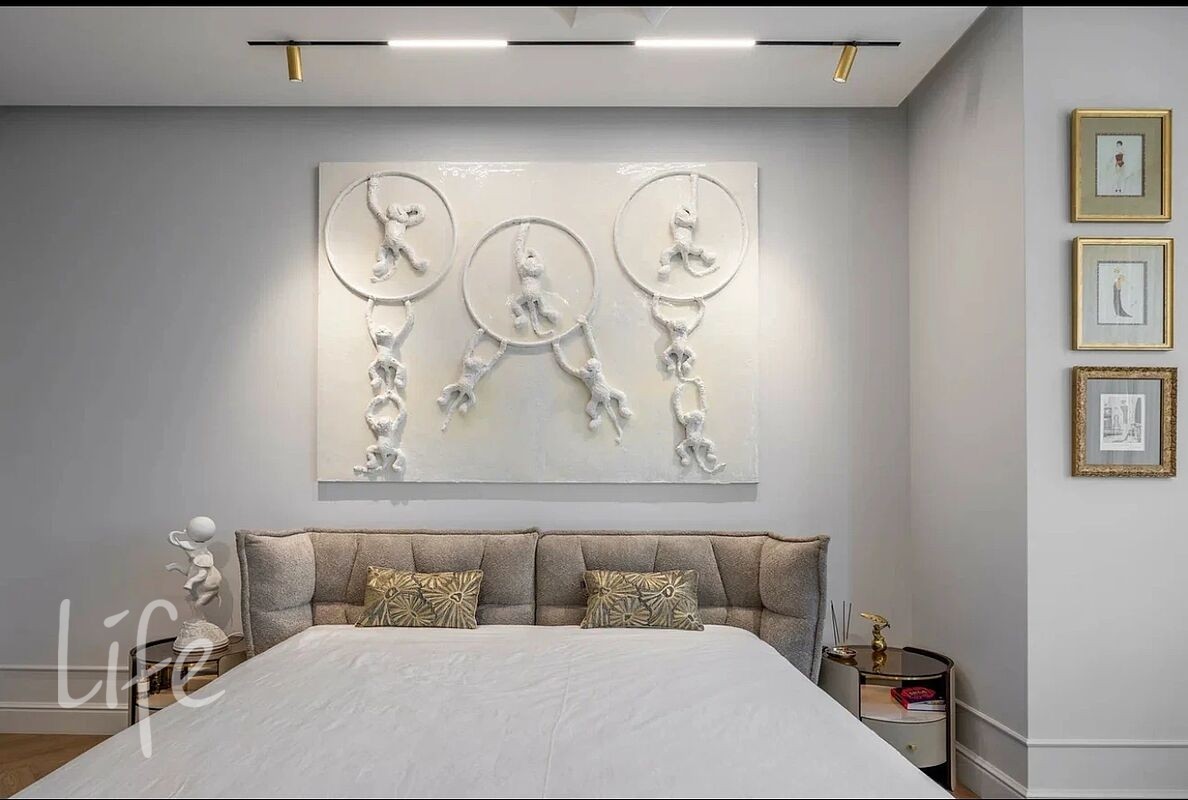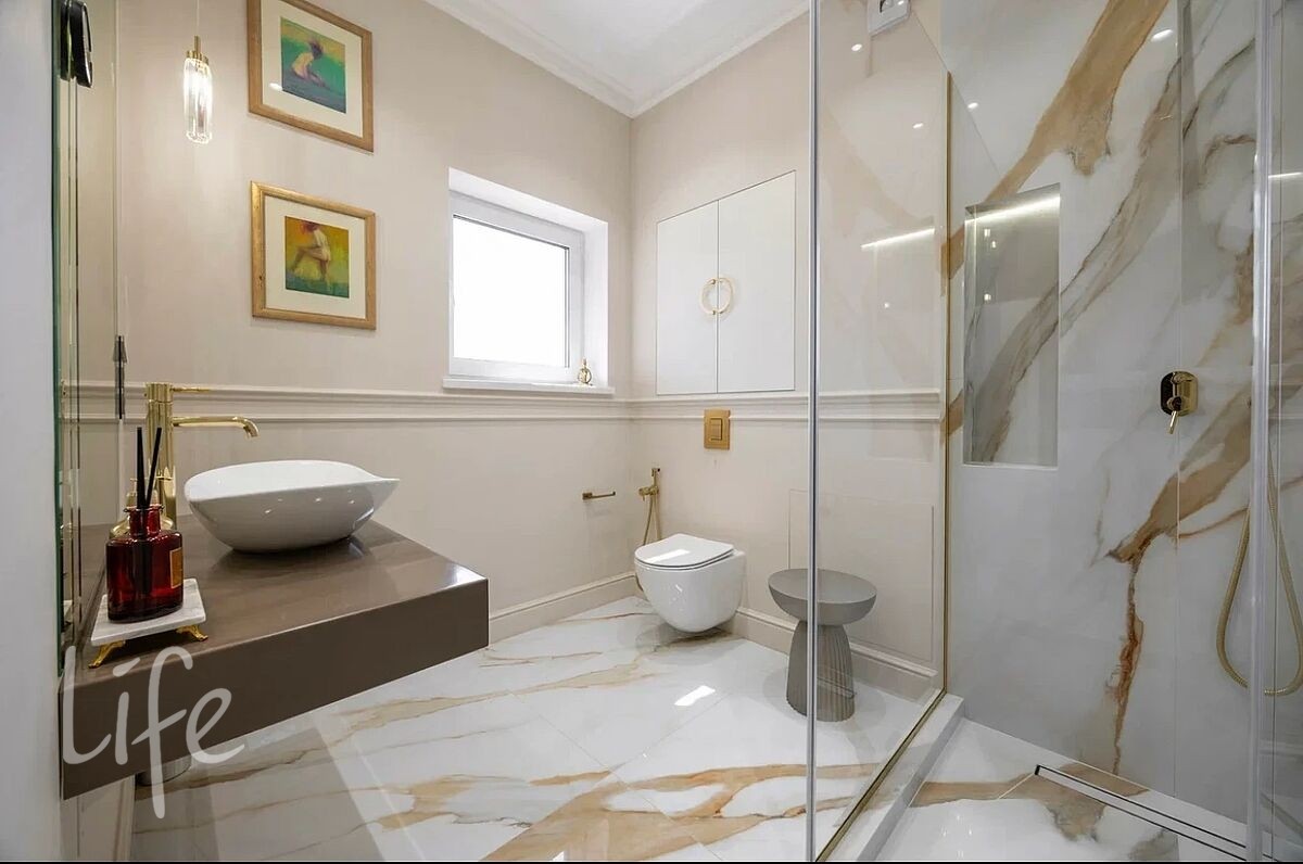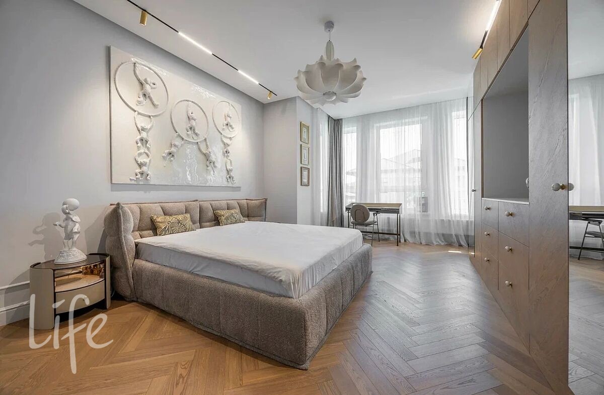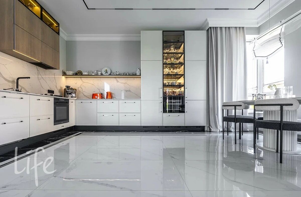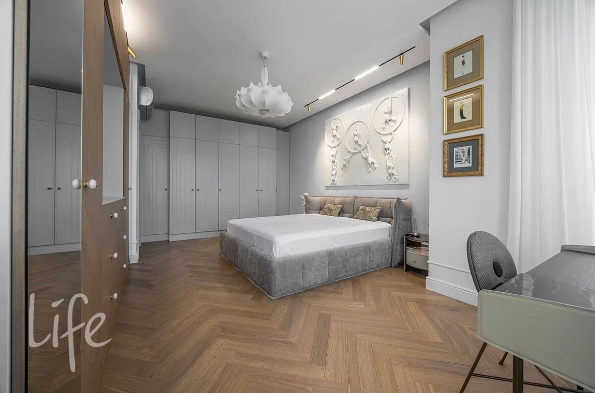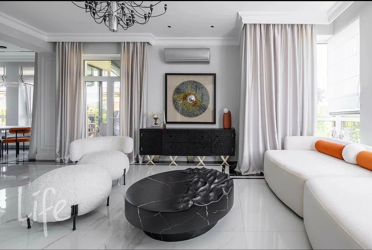 Современный интерьер, со вкусом подобрана мебель и аксессуары. Высокие потолки придают пространству легкость и свободу, а панорамные окна заливают интерьер естественным светом, создавая ощущение гармонии с природой.